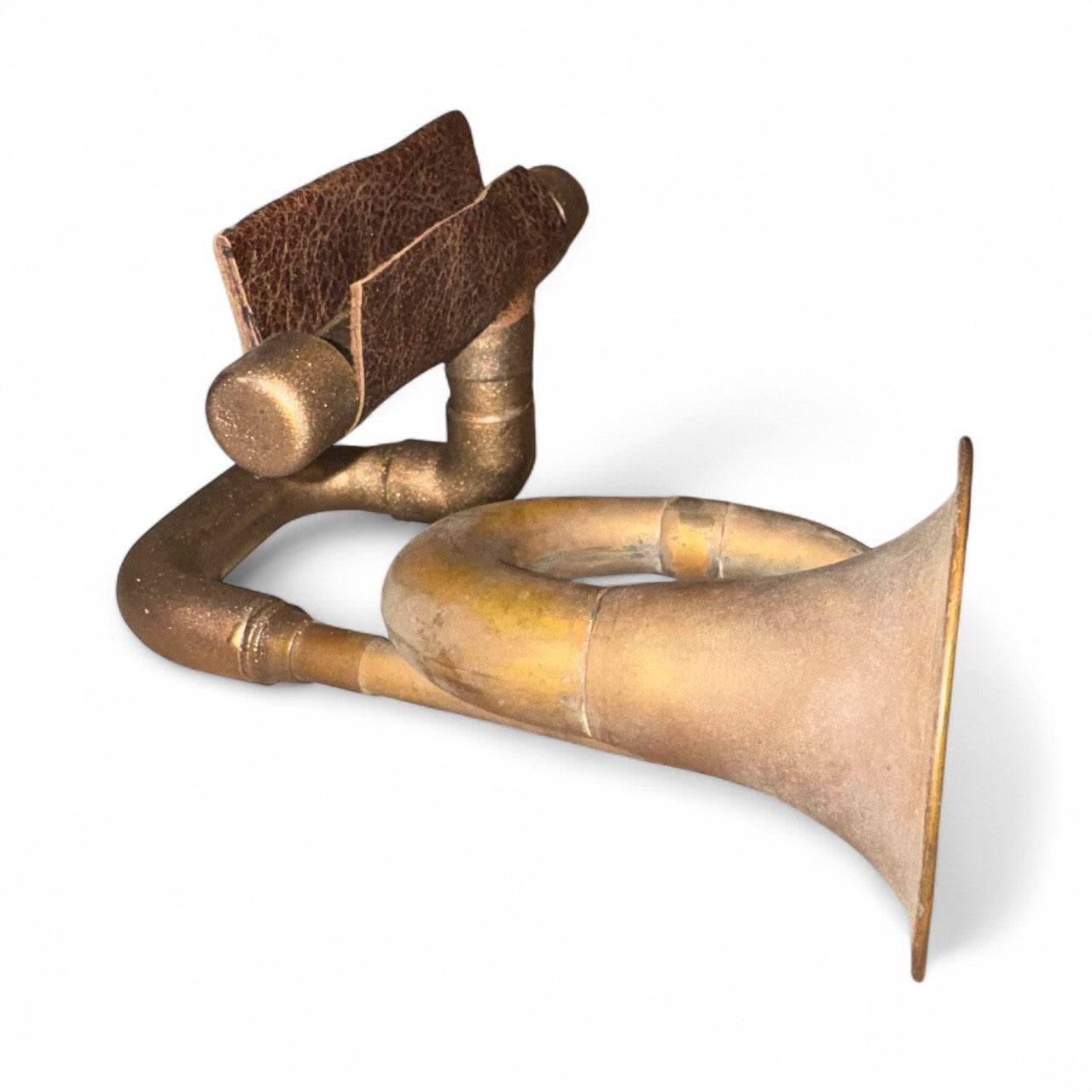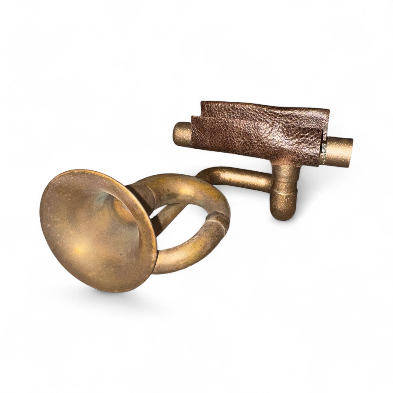 The Bike Horn iHorn is made from a vintage bicycle bulb horn. The bicycle bell was invented by John Richard Dedicoat,and patents for bicycle bells appear as early as 1877. A "bulb horn" is operated by squeezing a rubber bulb attached to a metal horn, producing a single note through a metal reed. In some places, bicycle horns are required equipment. In the Summer of 2012, NYPD set up bicycle equipment checkpoints, pulling over cyclists and ticketing them for missing safety equipment, including horns or bells. One can only assume that a The Bike Horn iHorn would meet those safety requirements, while providing hours of listening enjoyment without the pain and annoyance of ear buds. So ride into the sunset with The Bike Horn iHorn.