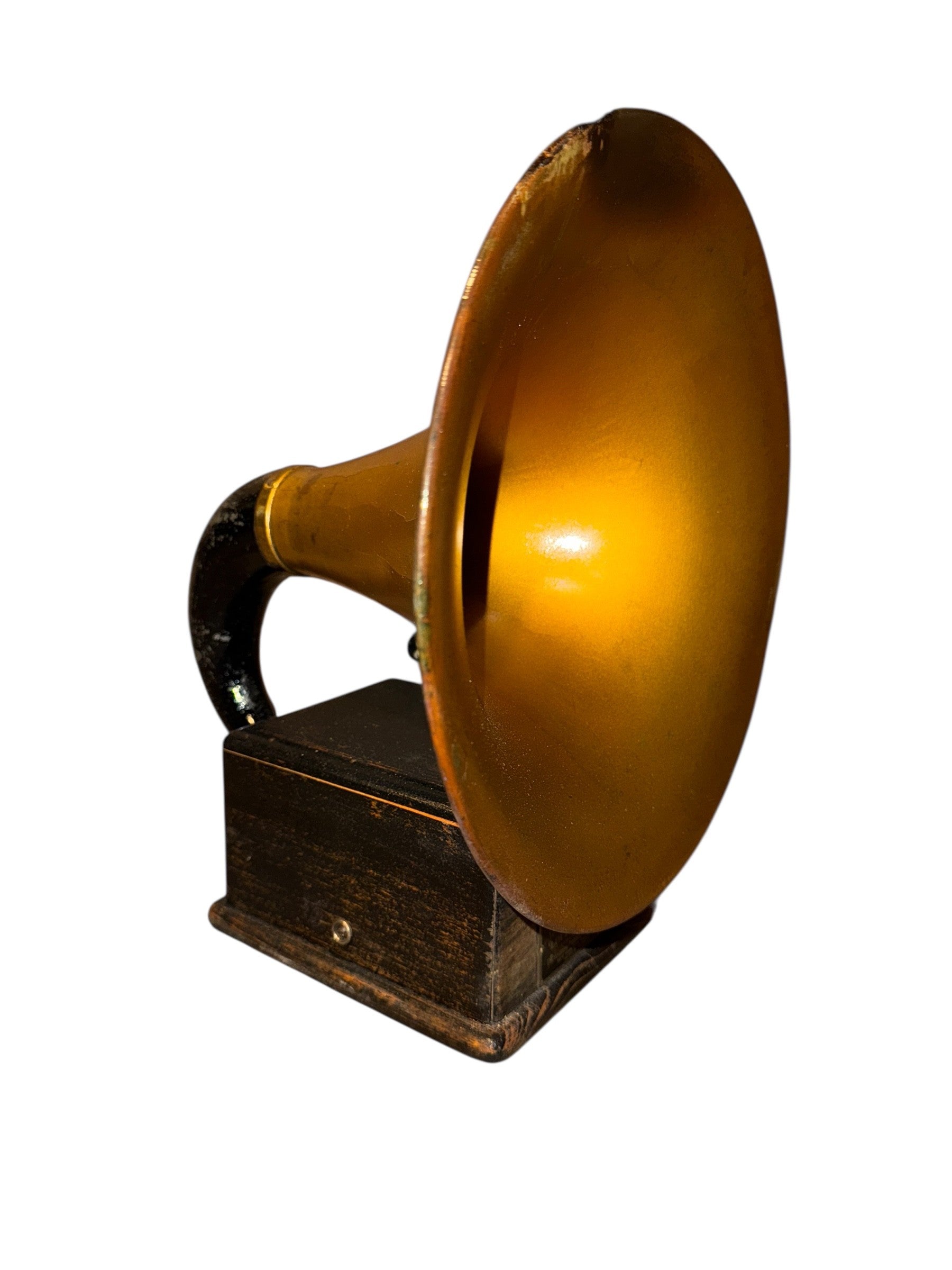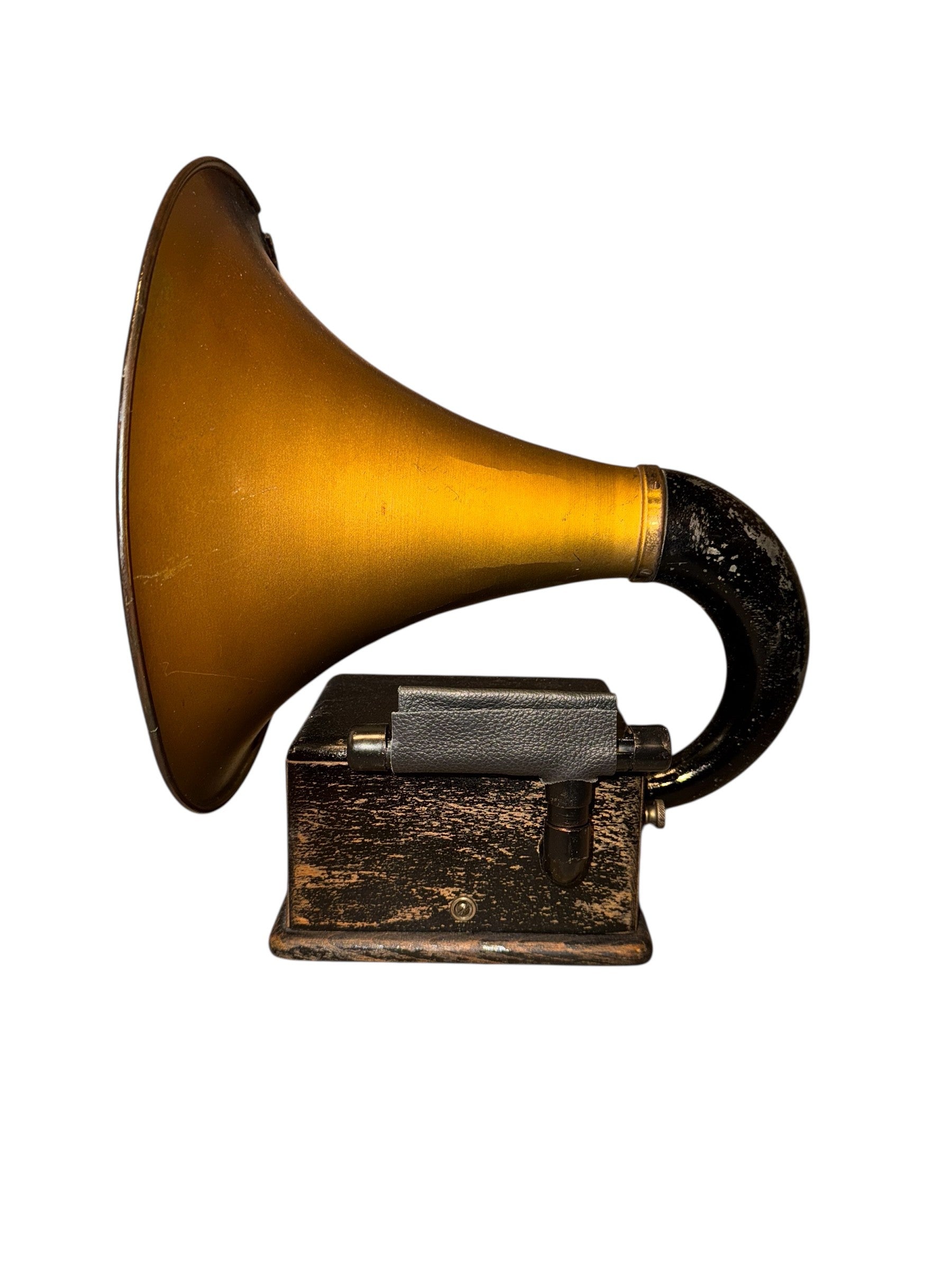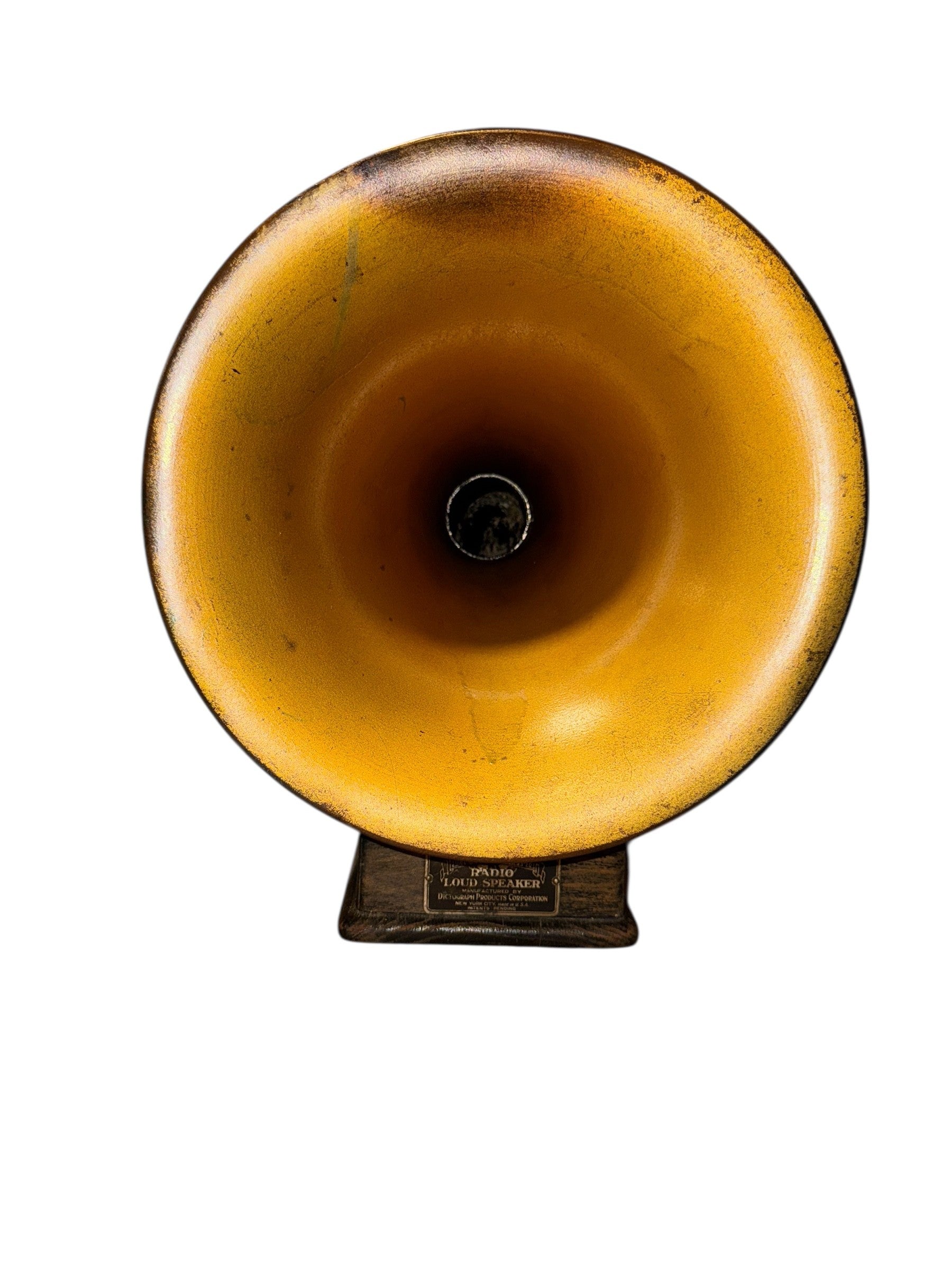 The Brass Dictogrand iHorn is made from a Dictogrand Type R-3 Radio Loud Speaker, which was made by the Dictograph Products Corporation in New York City. This was a low profile, “portable” speaker made in 1923. It came in black, mahogany, rubber, red, and this brass finish. This model is particularly rare and collectible. Its original sale price when first made was $29.00. Applying the consumer price index from 1923 to 2013, this would equate to $410.00 today!!! This is a cumulative inflation rate of 1312%. Dictograph Products was a new player in radio technology in 1923. However, Dictograph had a long history of acoustical products, including telephone systems and products to aid hearing for the deaf. It was an international corporation, with offices in United States, Europe, and the Orient. Its most famous product was the “Detective Dictograph Audio Amplifier.” This police eavesdropping device was used to convict Ohio state senator Rodney J. Diegle of bribery in 1911; U.S. Senator William Lorimer of Illinois for suborning perjury in 1912; and to indict Albert and Louis Bimberg of White Plains, N.Y., for trying to hire an employee to burn the American Oilcloth Co. plant in Trenton, N.J. in 1914. Dictograph Products was a big player in telephone equipment parts as well. The Brass Dictogrand is small and stately. It is a piece of Americana which reflects ingenuity, beauty and grace. Its appearance and sound are symphonic.