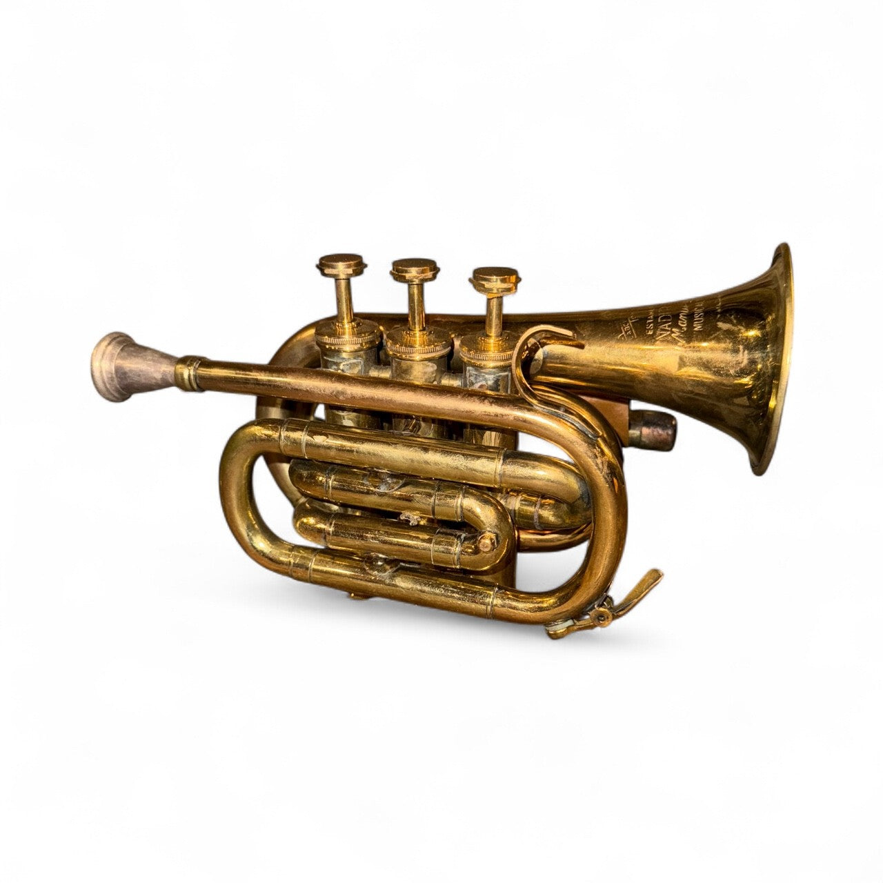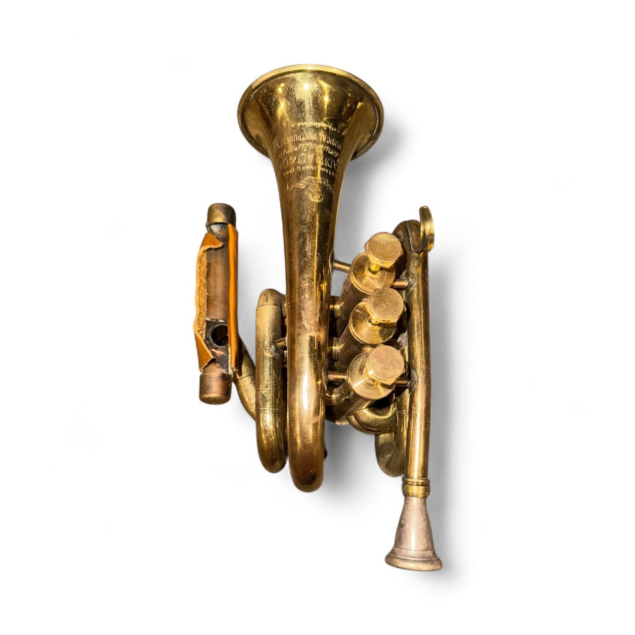 The Pocket Trumpet iHorn is made literally from a vintage pocket trumpet. The pocket trumpet is a compact size B♭ trumpet, with the same playing range as the regular trumpet. The length of the tubing, if straightened, would measure the same as that of a standard trumpet. However, the tubing is wound more tightly than that of a standard trumpet to reduce the instrument's size while retaining the characteristic sound. The bell is generally of smaller diameter than a standard trumpet. Pocket cornets have been constructed since the 1870s and are used in marching bands. The Pocket Trumpet iHorn is small and compact, but jazzy and boisterous.