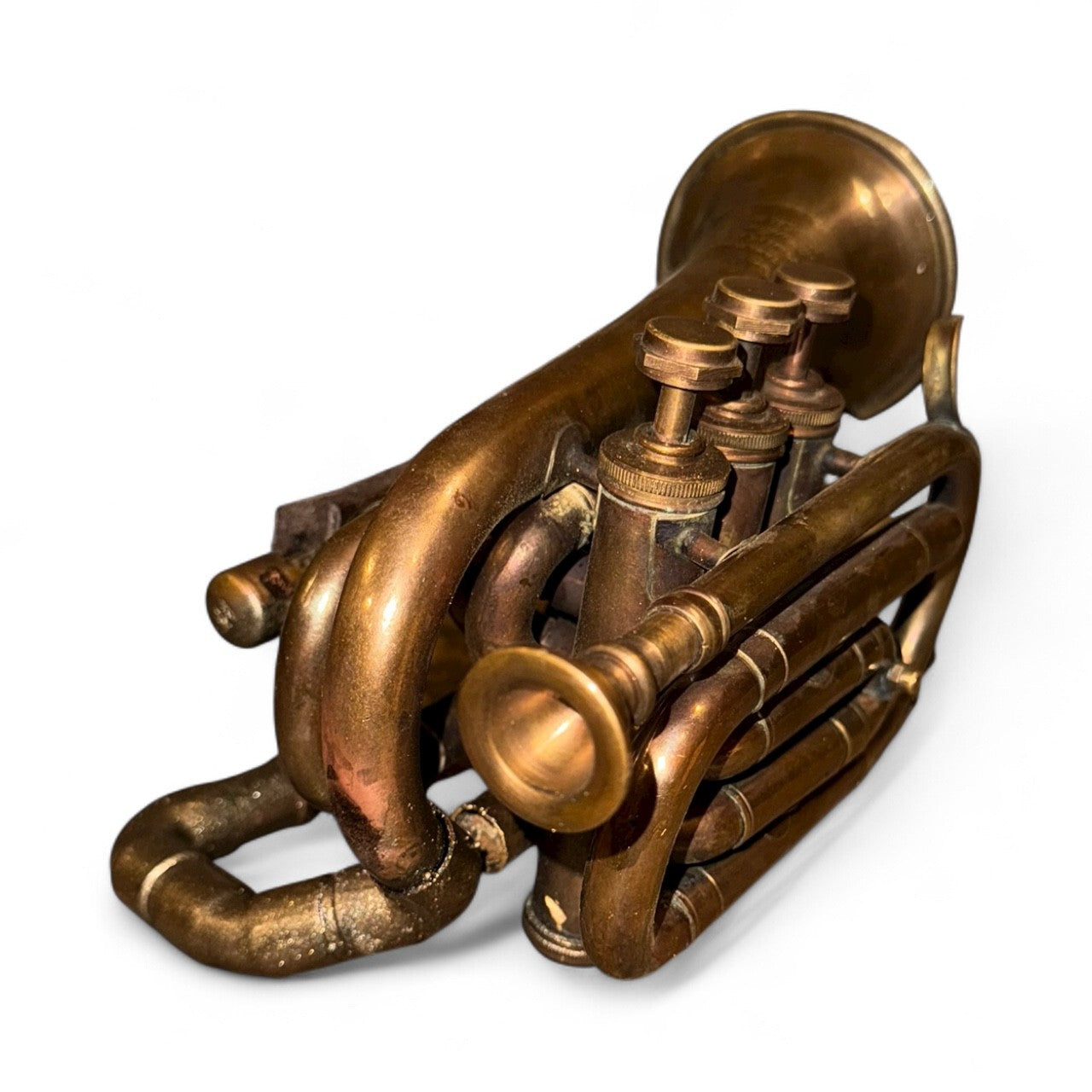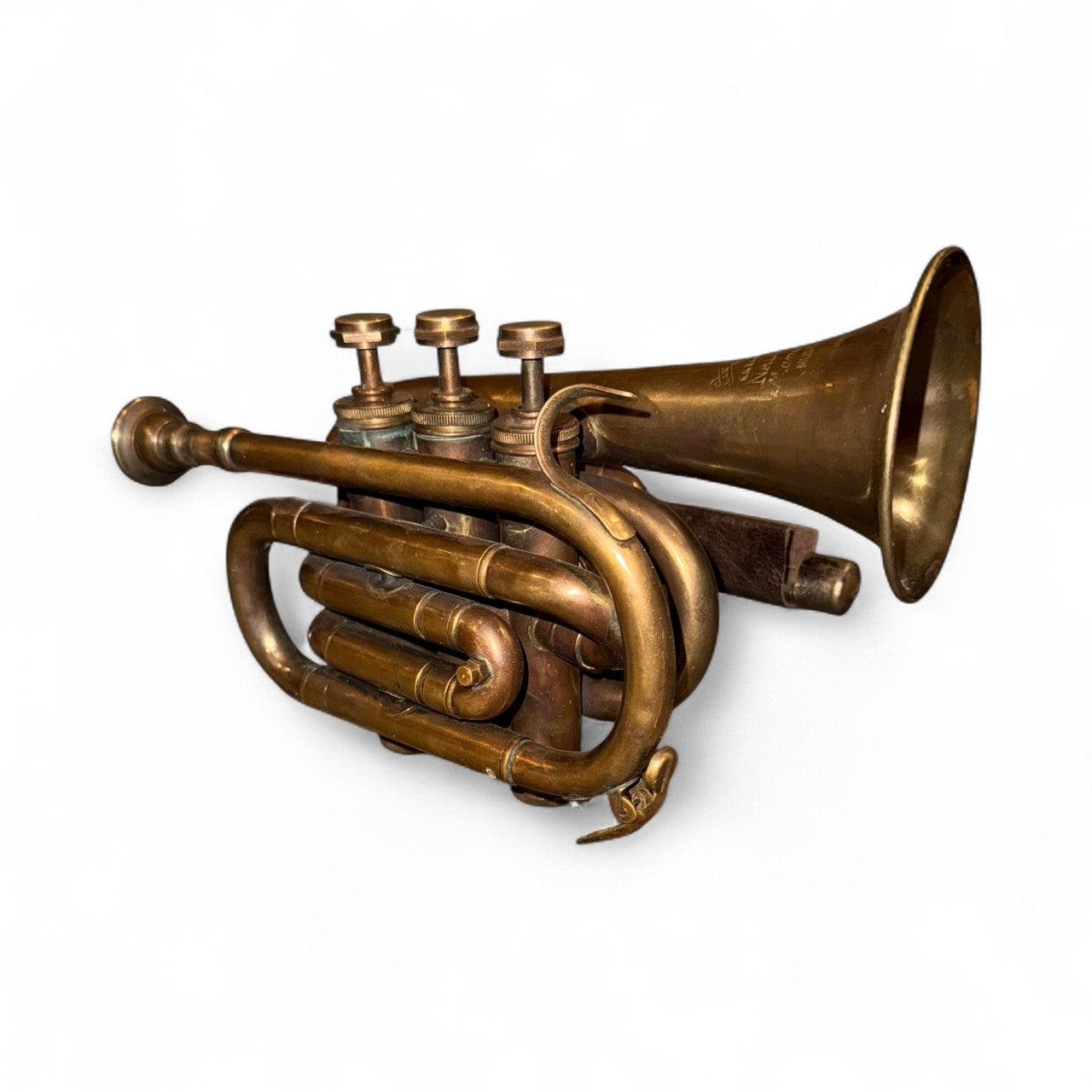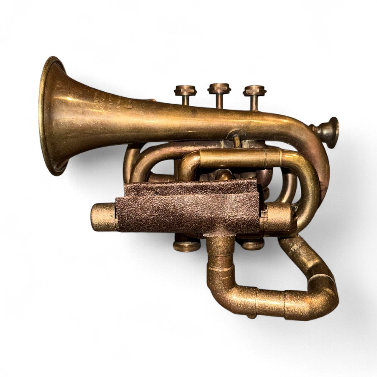 The Pocket Trumpet iHorn is made literally from a vintage pocket trumpet. The pocket trumpet is a compact size B♭ trumpet, with the same playing range as the regular trumpet. The length of the tubing, if straightened, would measure the same as that of a standard trumpet. However, the tubing is wound more tightly than that of a standard trumpet to reduce the instrument's size while retaining the characteristic sound. The bell is generally of smaller diameter than a standard trumpet. Pocket cornets have been constructed since the 1870s and are used in marching bands. The Pocket Trumpet iHorn is small and compact, but jazzy and boisterous.