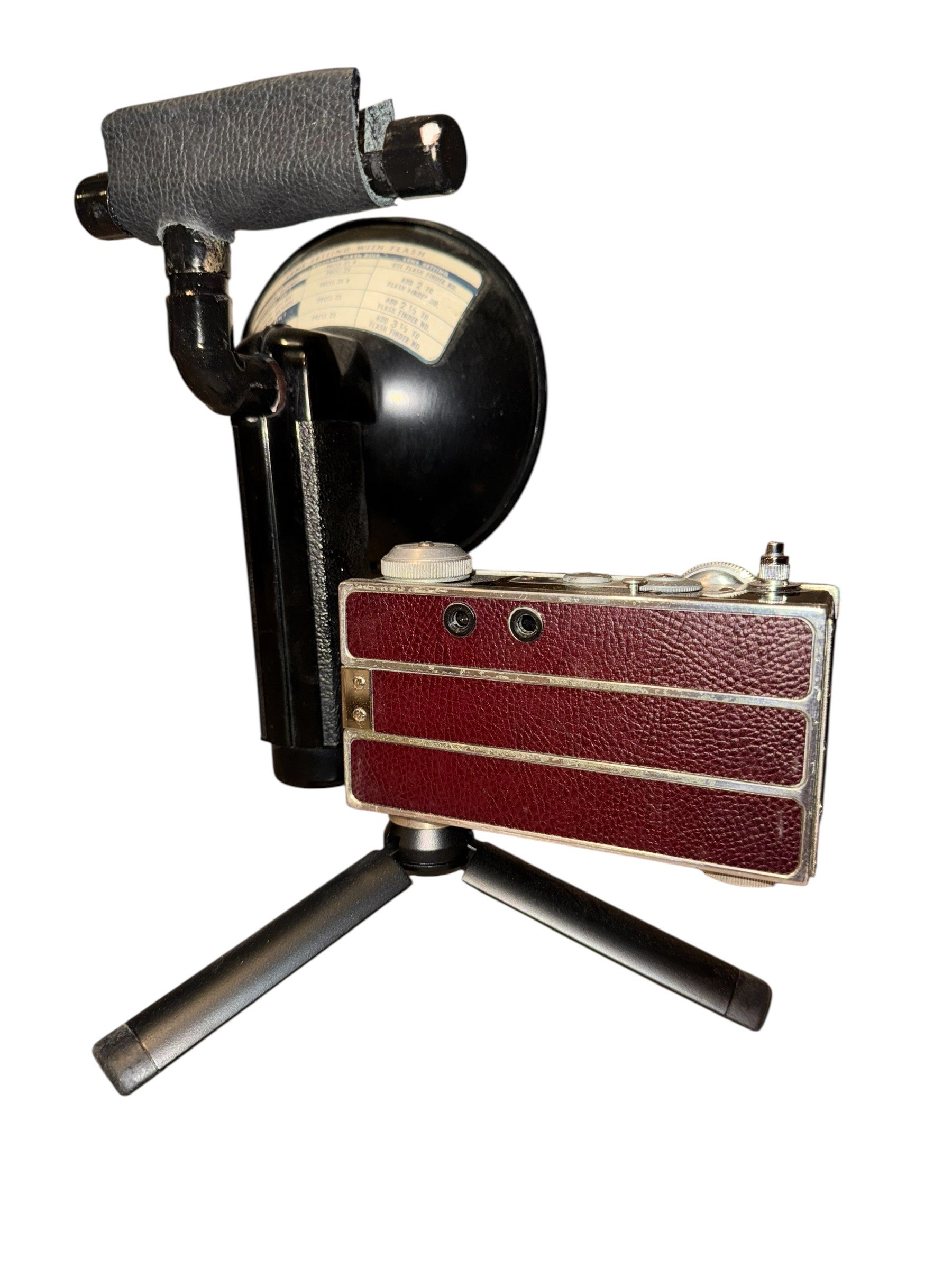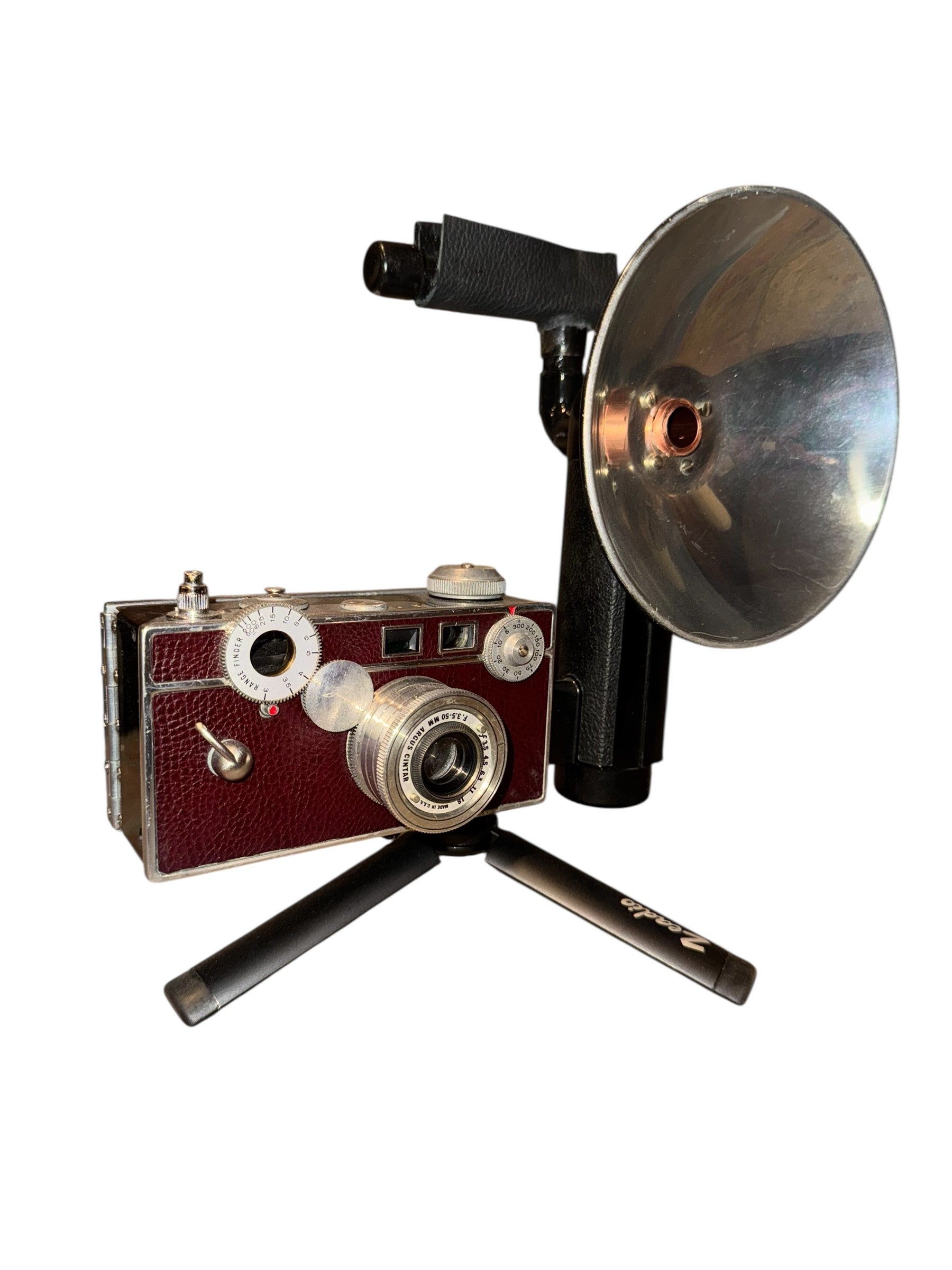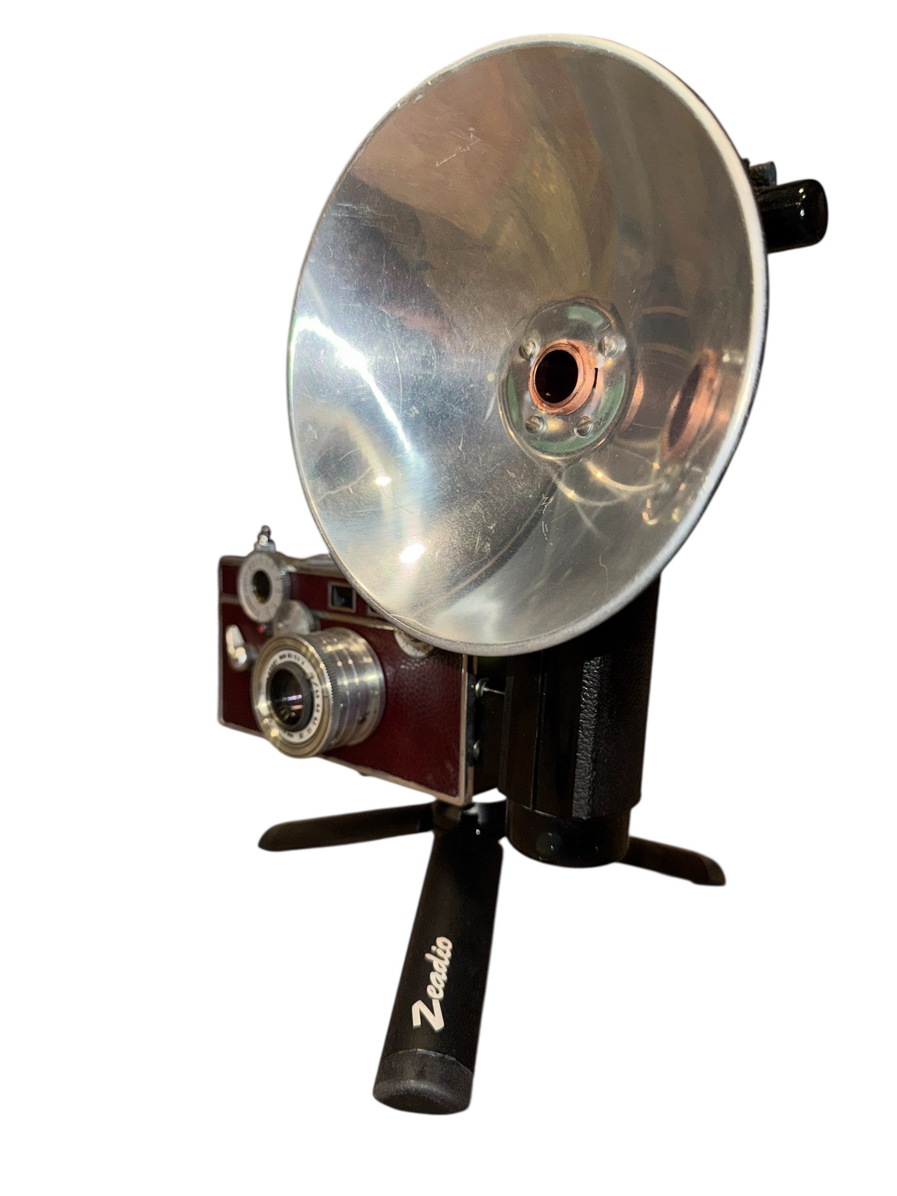 The Burgundy Argus iHorn is made from an Argus C3 Cintar camera. The flash housing serves as the bell. The Argus C3 is a metal frame camera wrapped in pseudo-leather. As originally manufactured, the C3 came in khaki or black, but the adventurous who desired self expression could personalize the C3 with after market skins. It was made between 1939 and 1957 in Ann Arbor, Michigan. It shot 35 mm film. It was probably the single largest-selling non-single-use 35mm camera in history. Over 2 million were sold during its lifetime, with its size and shape earning it the nickname of “the Brick.” Like all cameras, The Burgundy Argus iHorn is a snapshot in time.