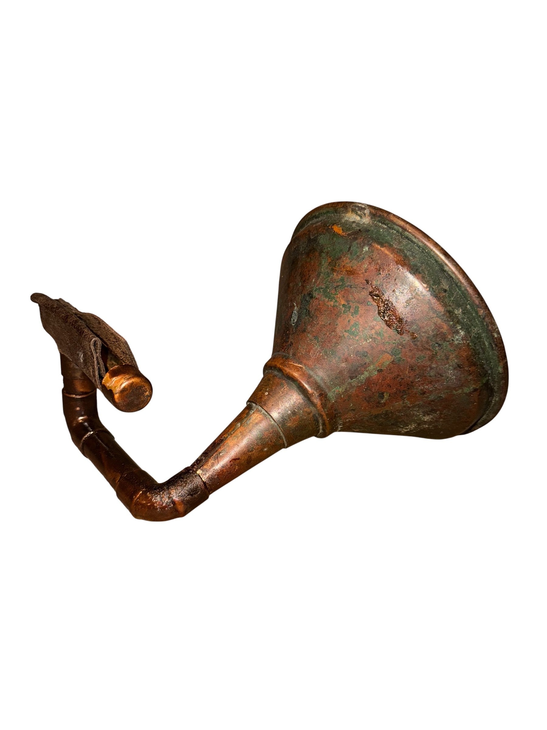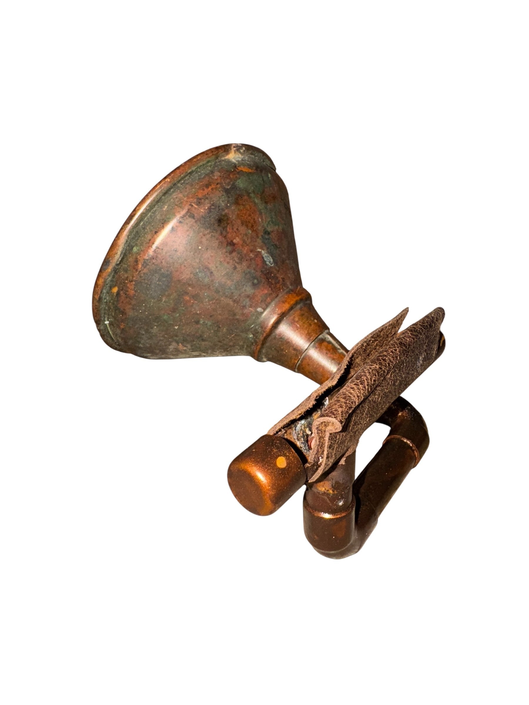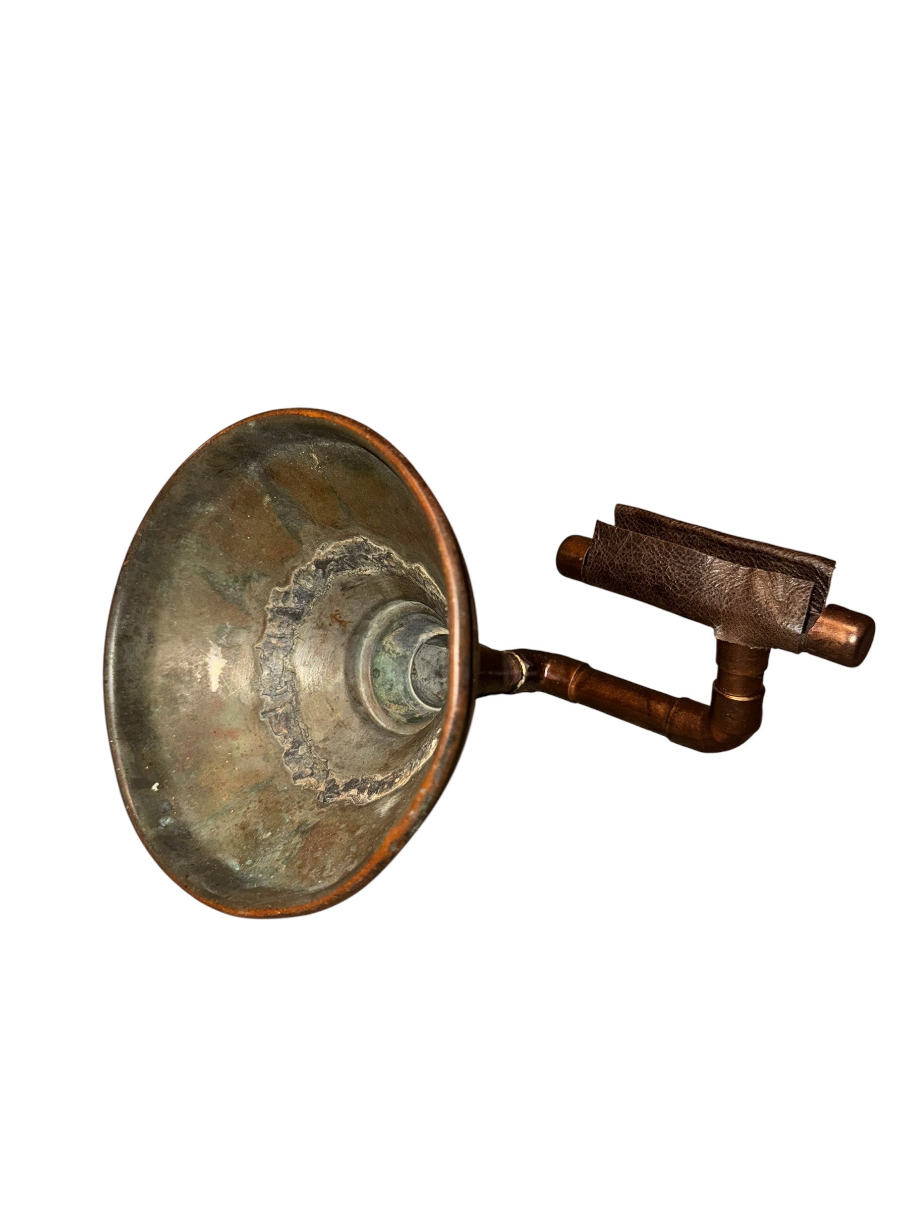 The Copper Funnel iHorn is made from a hand made antique copper funnel, probably from the prohibition era.  Copper funnels were used as part of the still in the manufacture of illegal alcohol when our government decided it was prudent to legislate morality, an experiment gone awry.  The Copper Funnel iHorn is a simple yet effective tool, its patina and functionality work as well today as when it was first made.  Regardless of its age, The Copper Funnel iHorn is remarkable in simplicity and grace.