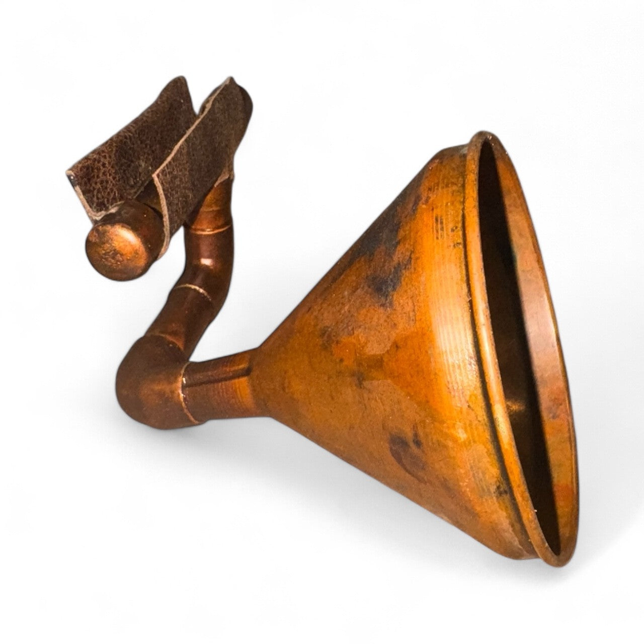 The Copper Funnel iHorn is made from a hand made antique copper funnel, probably from the prohibition era. Copper funnels were used as part of the still in the manufacture of illegal alcohol when our government decided it was prudent to legislate morality, an experiment gone awry. The Copper Funnel iHorn is a simple yet effective tool, its patina and functionality work as well today as when it was first made. Regardless of its age, The Copper Funnel iHorn is remarkable in simplicity and grace.