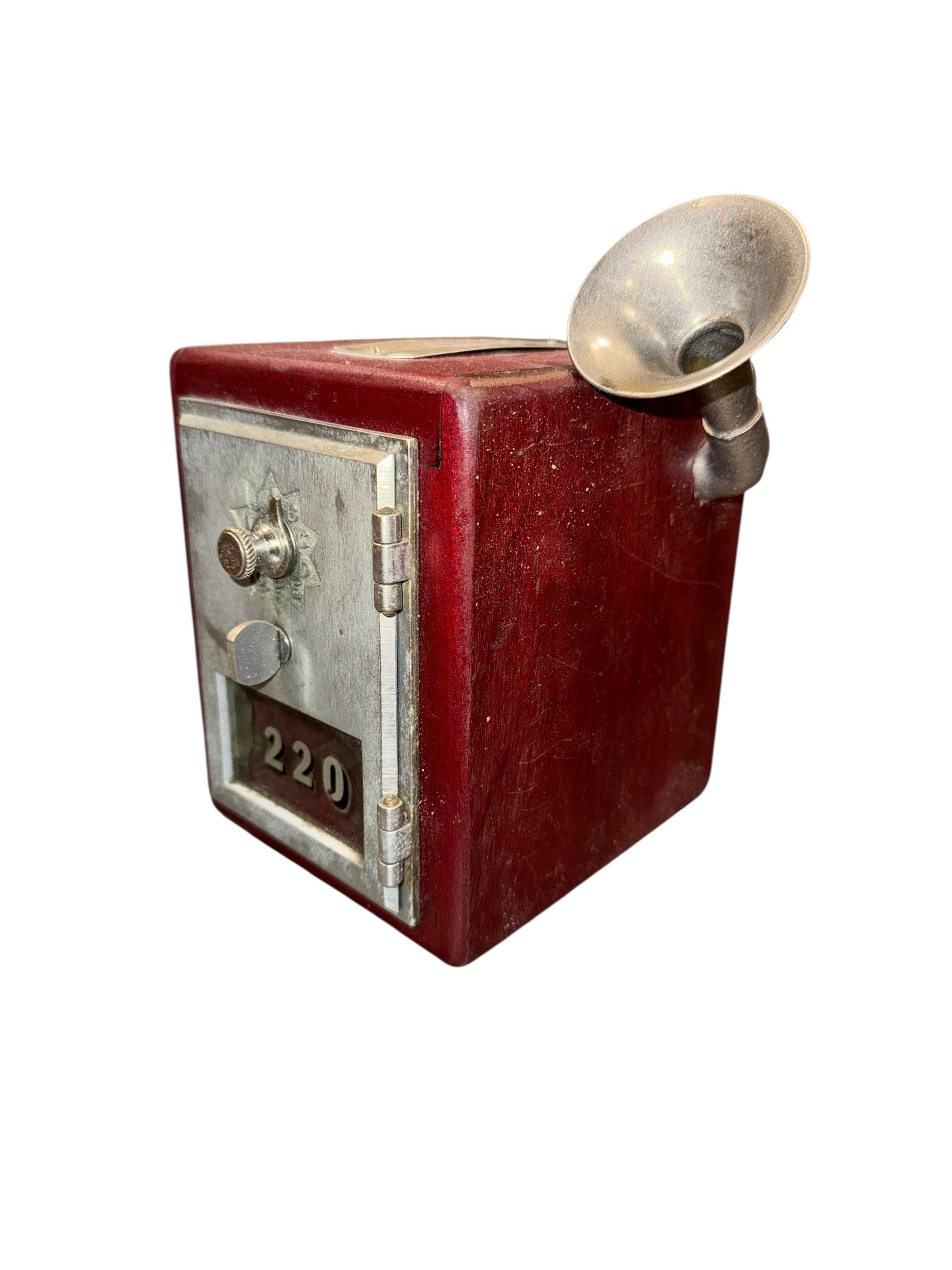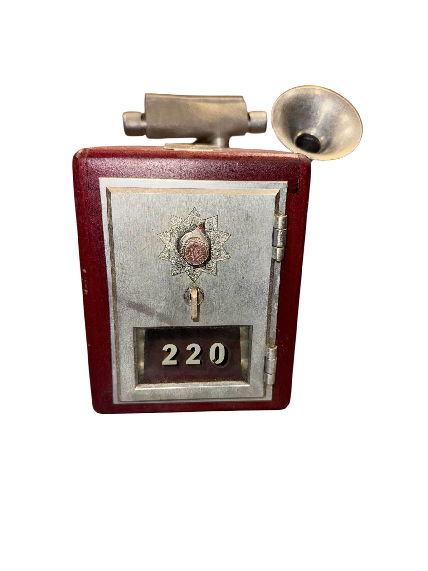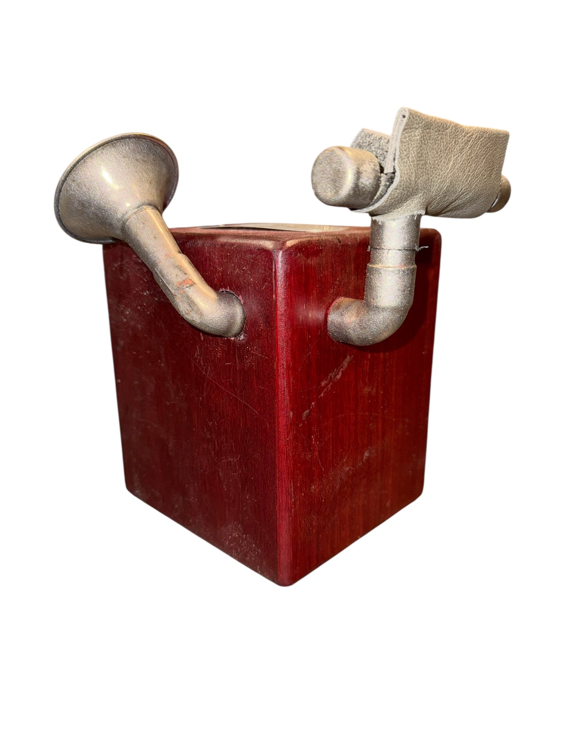 DM ME iHorn is made from an antique post office box coupled with a small fox hunting horn. A post office box is a uniquely addressable lockable box located on the premises of a post office. The first post office boxes appeared in cities in American in the 1850s. Before email, text messages and DMs, the letter was the means of direct communication, and it’s no small task. In 2023, the USPS processed 152,300,000 first class mail pieces each day, which is a startling 3,684 pieces per second. Small but mighty. Well worn but time tested. The DM Me is the post master of both amplitude and quality. It is a functional piece which signals its intentions securely.