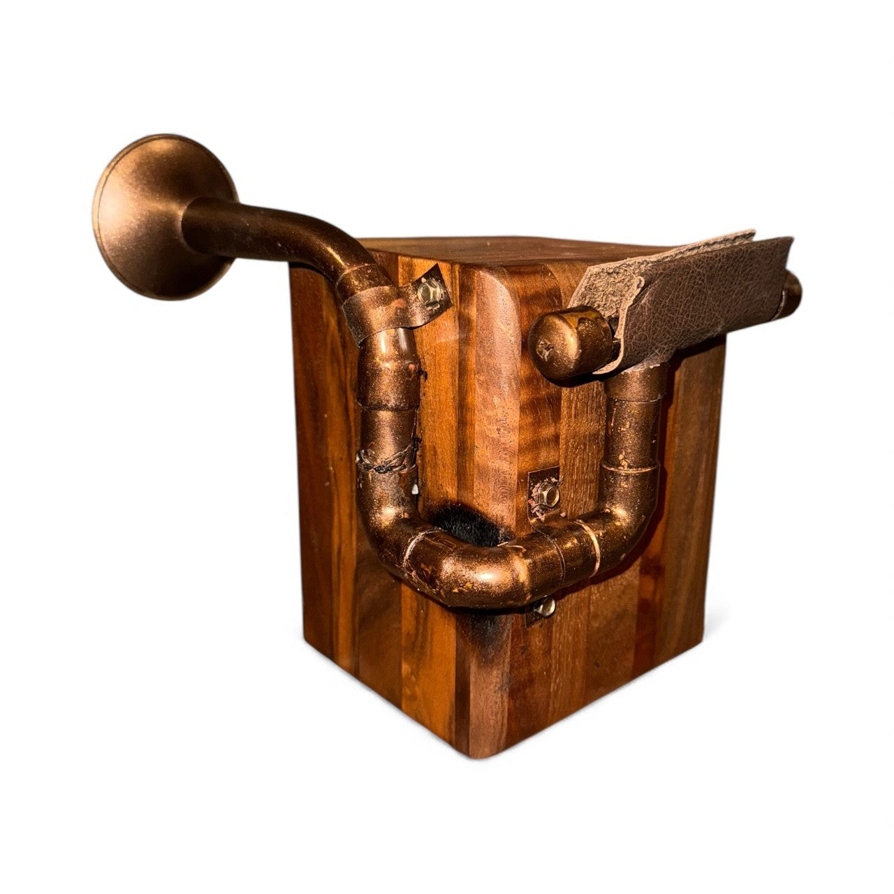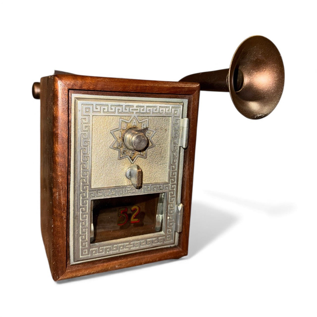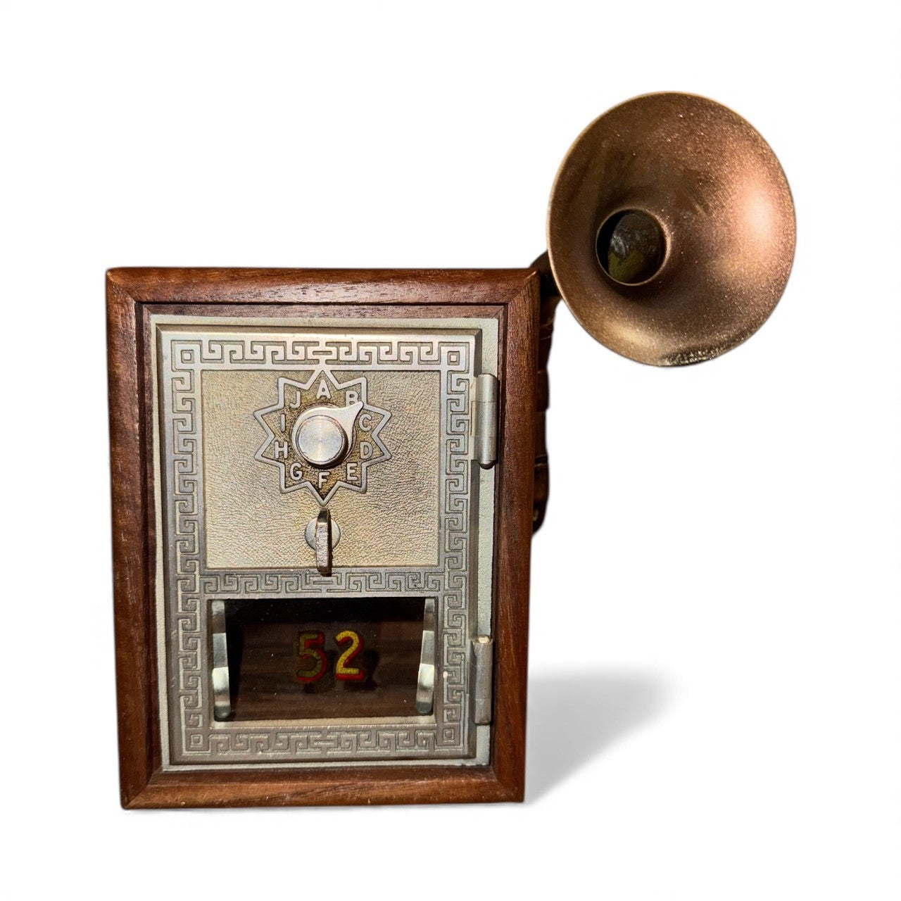 DM ME iHorn is made from an antique post office box coupled with a small fox hunting horn. A post office box is a uniquely addressable lockable box located on the premises of a post office. The first post office boxes appeared in cities in American in the 1850s. Before email, text messages and DMs, the letter was the means of direct communication, and it’s no small task. In 2023, the USPS processed 152,300,000 first class mail pieces each day, which is a startling 3,684 pieces per second. Small but mighty. Well worn but time tested. The DM Me is the post master of both amplitude and quality. It is a functional piece which signals its intentions securely.