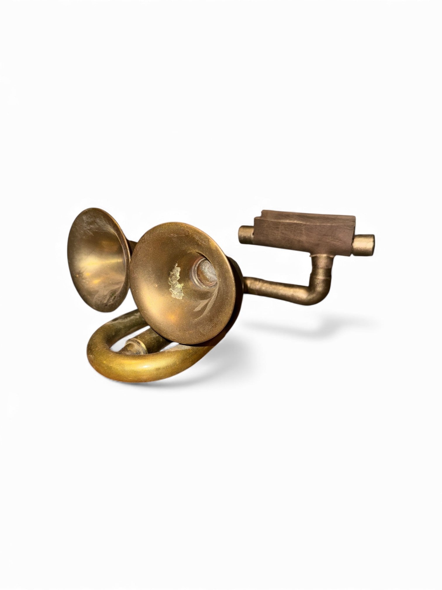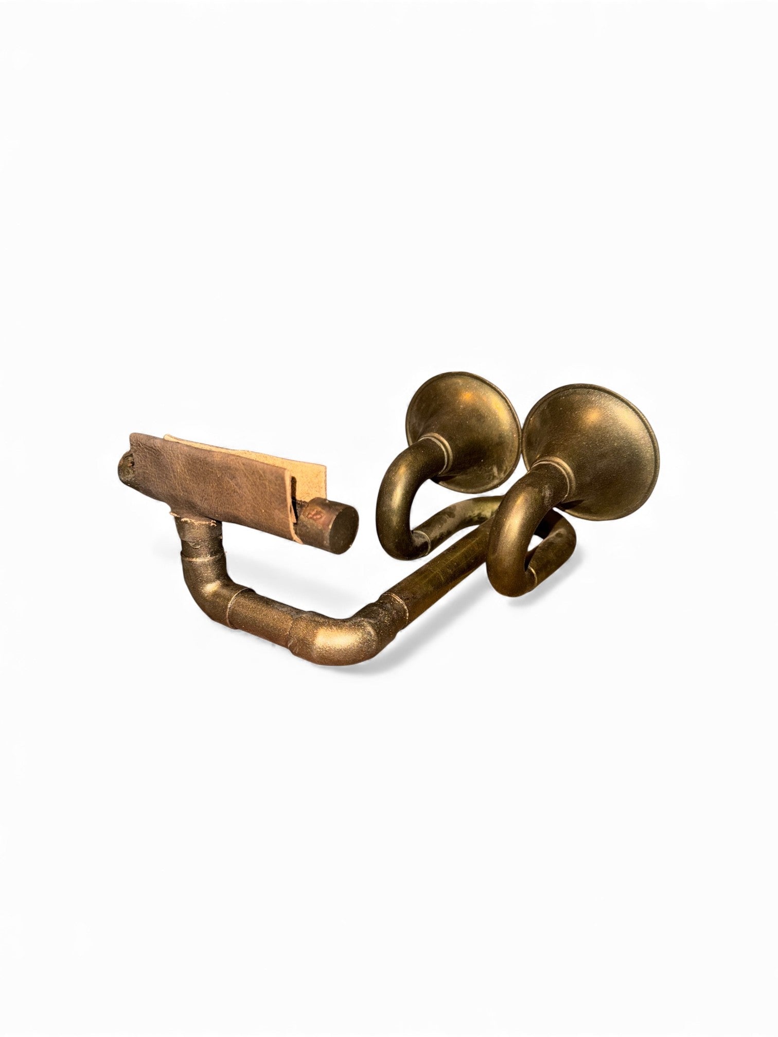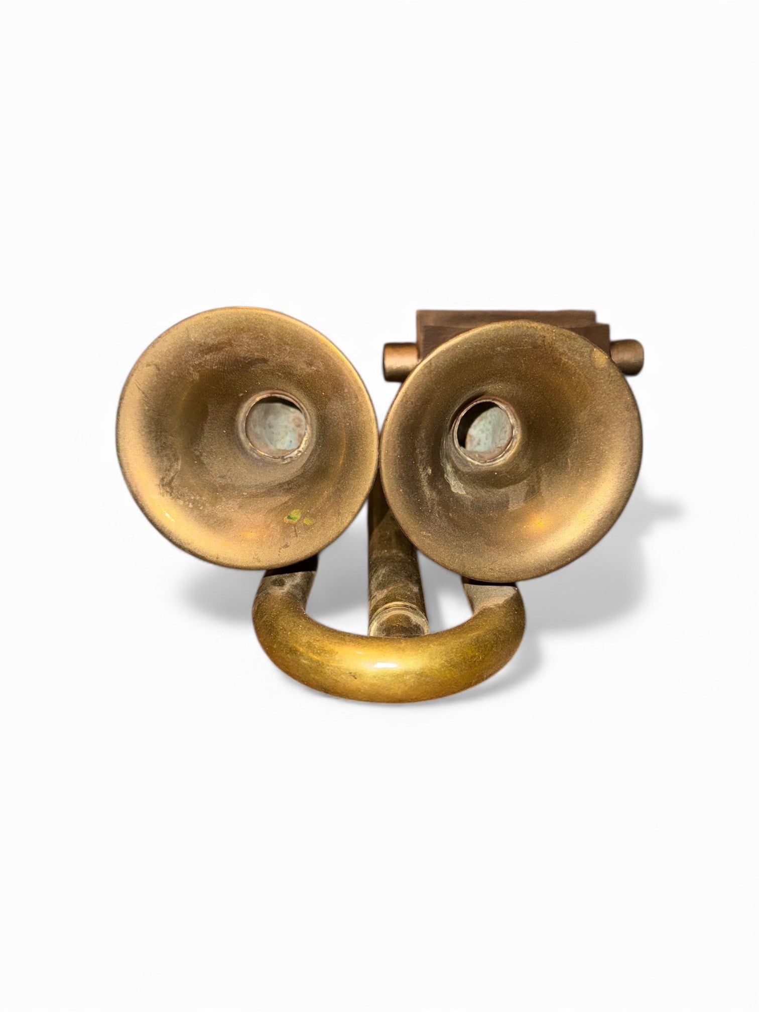 The Double Bell iHorn is made from a vintage bicycle bulb horn. The bicycle bell was invented by John Richard Dedicoat,and patents for bicycle bells appear as early as 1877. A "bulb horn" is operated by squeezing a rubber bulb attached to a metal horn, producing a single note through a metal reed. In some places, bicycle horns are required equipment. In the Summer of 2012, NYPD set up bicycle equipment checkpoints, pulling over cyclists and ticketing them for missing safety equipment, including horns or bells. One can only assume that a The Bike Horn iHorn would meet those safety requirements, while providing hours of listening enjoyment without the pain and annoyance of ear buds. So ride into the sunset with The Double Bell iHorn.