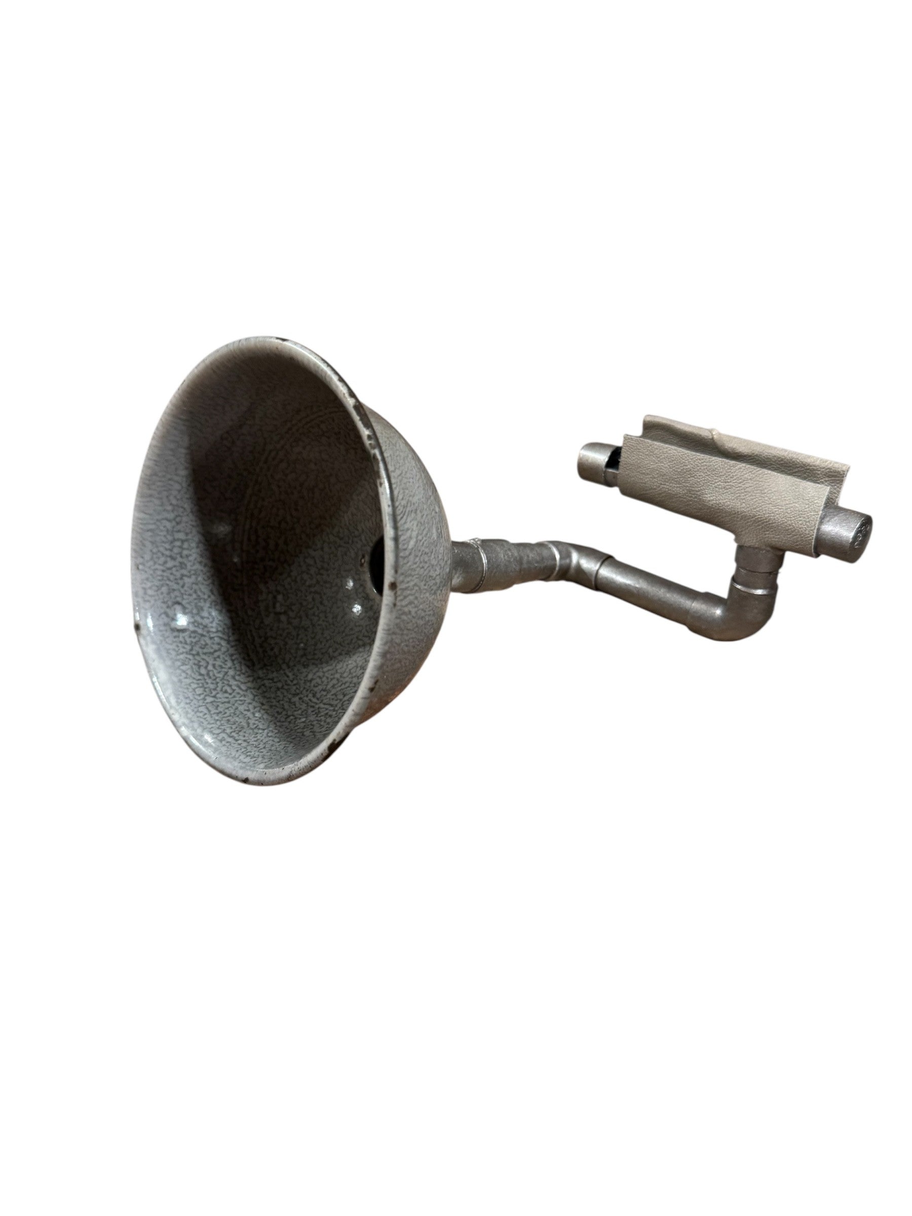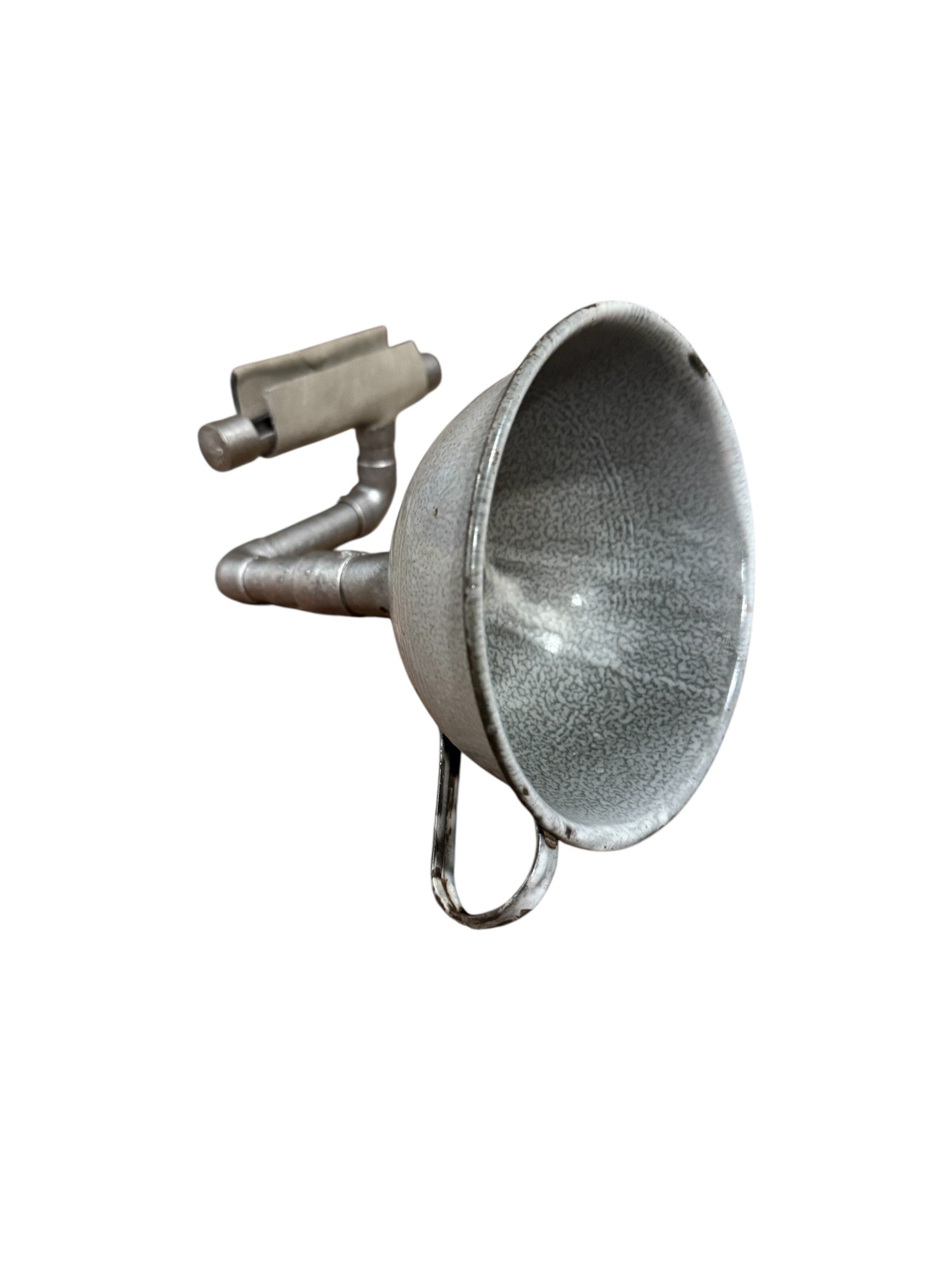The Enamelware iHorn is made from a gray enamelware funnel. This multifunctional device, should be limited to a single purpose use at one time. Enamelware was typically manufactured sometime between the late 1800’s up to the end of World War II. The first two big US companies making enamel homewares were founded by migrants from Europe in the 1860s. Frederick and William Niedringhaus built up the St. Louis Stamping Co. in Missouri, then moved graniteware production to Granite City, Illinois. They later evolved into NESCO, whose grey enamel was sometimes said to flow from "pure melted granite." They got the first US patent for a mottled enamel finish. A funnel is a useful tool, ideally shaped for the transfer of all kinds of substances, but equally wonderful for the amplification of sound. Appropriate for a kitchen, it is both small enough and durable enough to be a mobile amplification system.