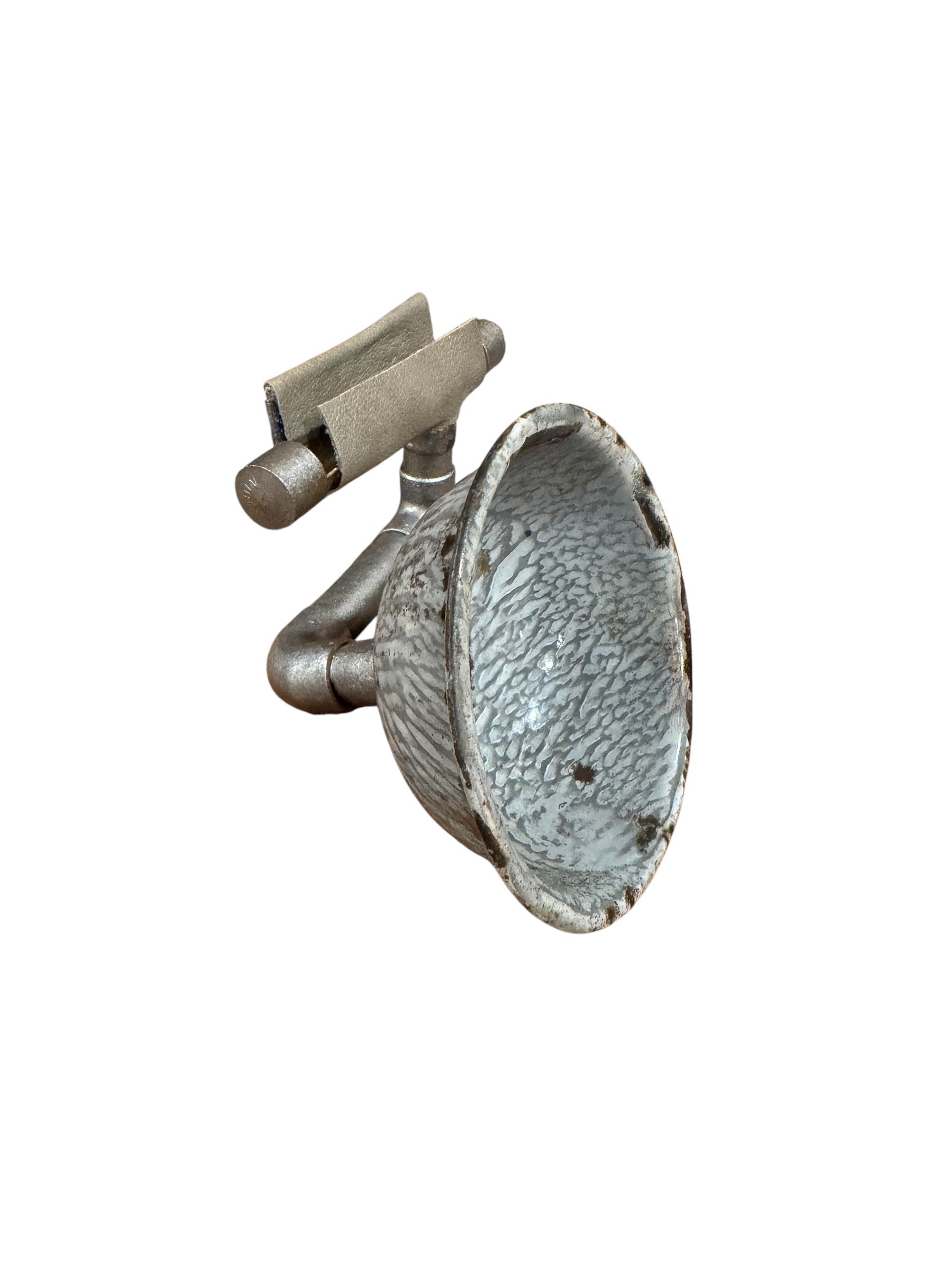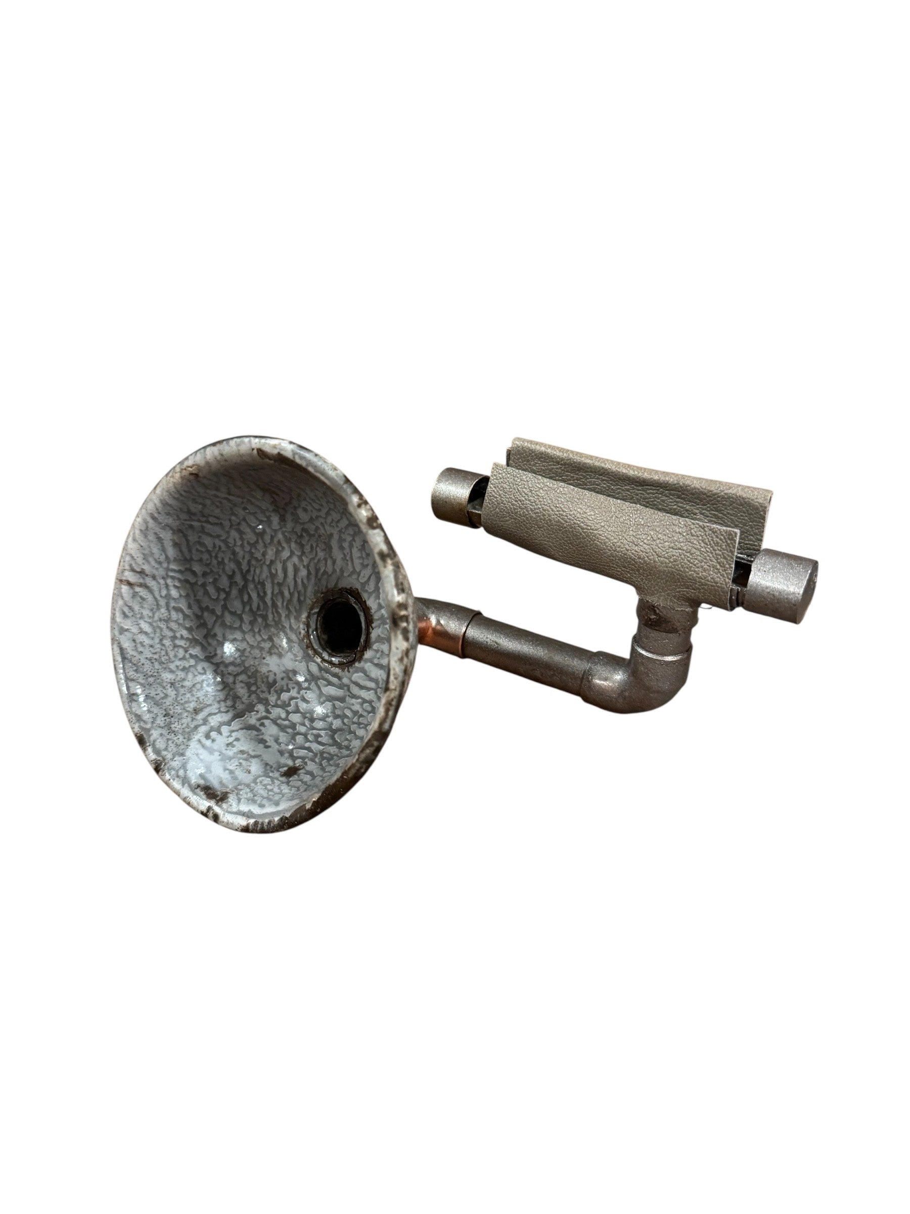 The Enamelware iHorn is made from a gray enamelware funnel. This multifunctional device, should be limited to a single purpose use at one time. Enamelware was typically manufactured sometime between the late 1800’s up to the end of World War II. The first two big US companies making enamel homewares were founded by migrants from Europe in the 1860s. Frederick and William Niedringhaus built up the St. Louis Stamping Co. in Missouri, then moved graniteware production to Granite City, Illinois. They later evolved into NESCO, whose grey enamel was sometimes said to flow from "pure melted granite." They got the first US patent for a mottled enamel finish. A funnel is a useful tool, ideally shaped for the transfer of all kinds of substances, but equally wonderful for the amplification of sound. Appropriate for a kitchen, it is both small enough and durable enough to be a mobile amplification system.