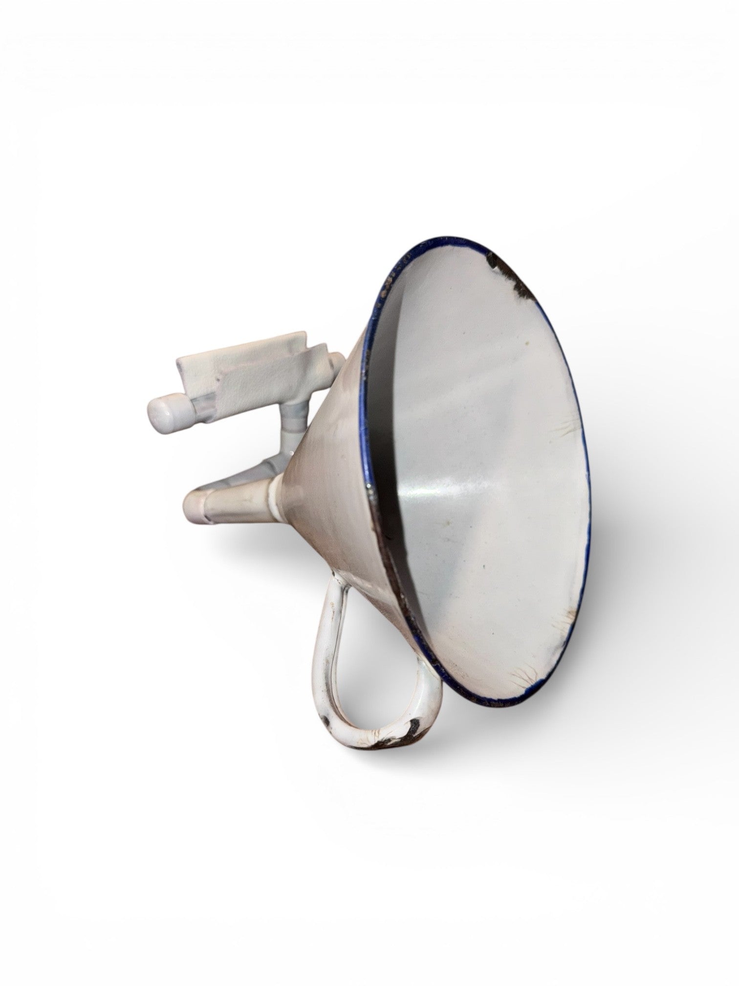 The Enamelware iHorn is made from an enamelware funnel. This multifunctional device, should be limited to a single purpose use at one time. Enamelware was typically manufactured sometime between the late 1800’s up to the end of World War II. The first two big US companies making enamel homewares were founded by migrants from Europe in the 1860s. Frederick and William Niedringhaus built up the St. Louis Stamping Co. in Missouri, then moved graniteware production to Granite City, Illinois. They later evolved into NESCO, whose grey enamel was sometimes said to flow from "pure melted granite." They got the first US patent for a mottled enamel finish. A funnel is a useful tool, ideally shaped for the transfer of all kinds of substances, but equally wonderful for the amplification of sound. Appropriate for a kitchen, it is both small enough and durable enough to be a mobile amplification system.
