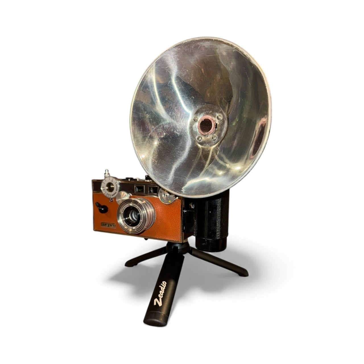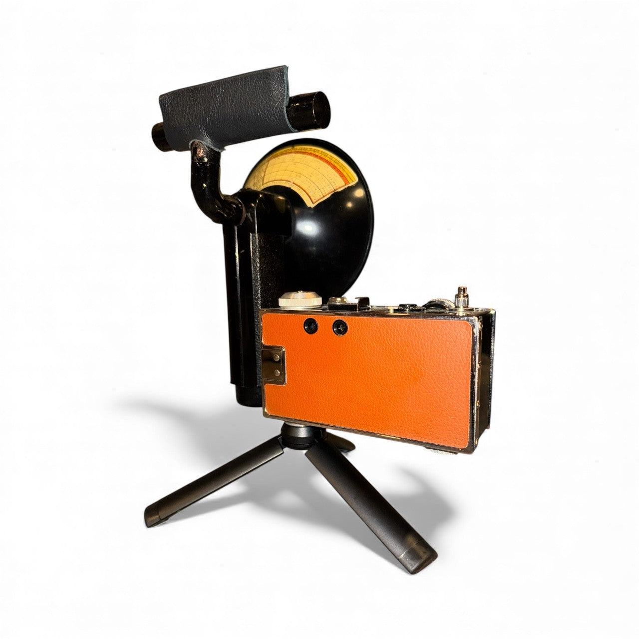 The Argus iHorn is made from an Argus C3 Cintar camera. The flash housing serves as the bell. The Argus C3 is a metal frame camera wrapped in pseudo-leather. As originally manufactured, the C3 came in khaki or black, but the adventurous who desired self expression could personalize the C3 with after market skins. It was made between 1939 and 1957 in Ann Arbor, Michigan. It shot 35 mm film. It was probably the single largest-selling non-single-use 35mm camera in history. Over 2 million were sold during its lifetime, with its size and shape earning it the nickname of “the Brick.” Like all cameras, The Argus iHorn is a snapshot in time.