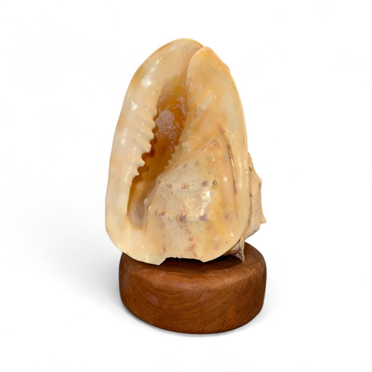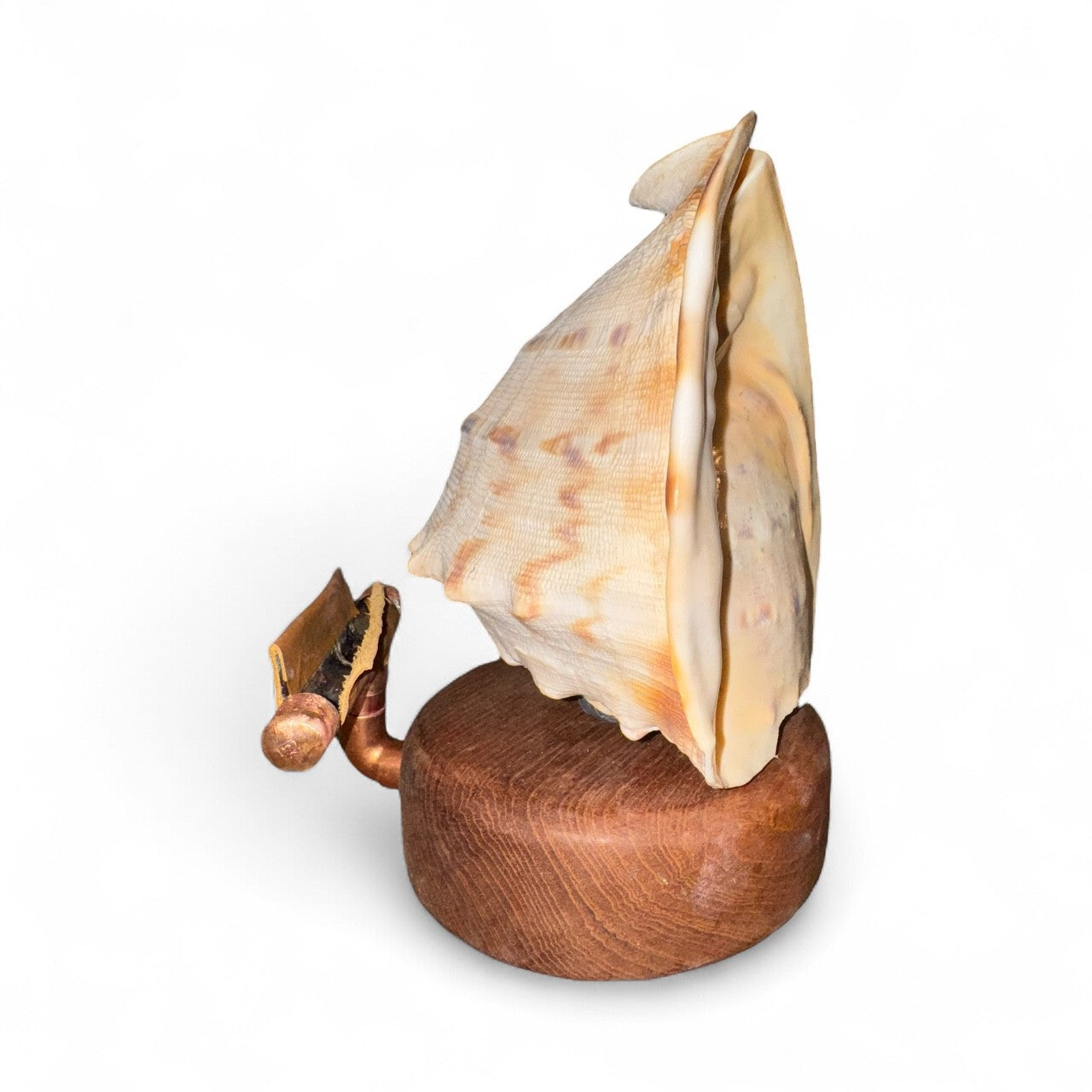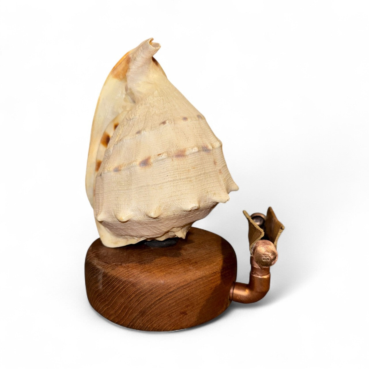 The Helmet Conch iHorn is a beautiful piece combining the elements of the earth and the sea to bring about melodies which are soothing and pleasing to the senses. The Conch shell is from the Florida Keys. The base is a midcentury Japanese bowl. Both maintain their original forms to remind us that nothing can match the marvel and beauty of nature. The Helmet Conch iHorn is voluminous and continuous, like waves lapping at the beach. The Helmet Conch is a pleasure to both listen to and view.