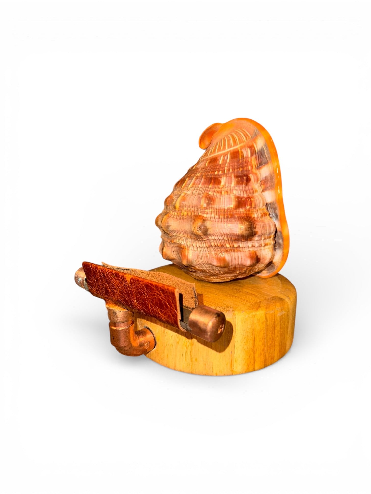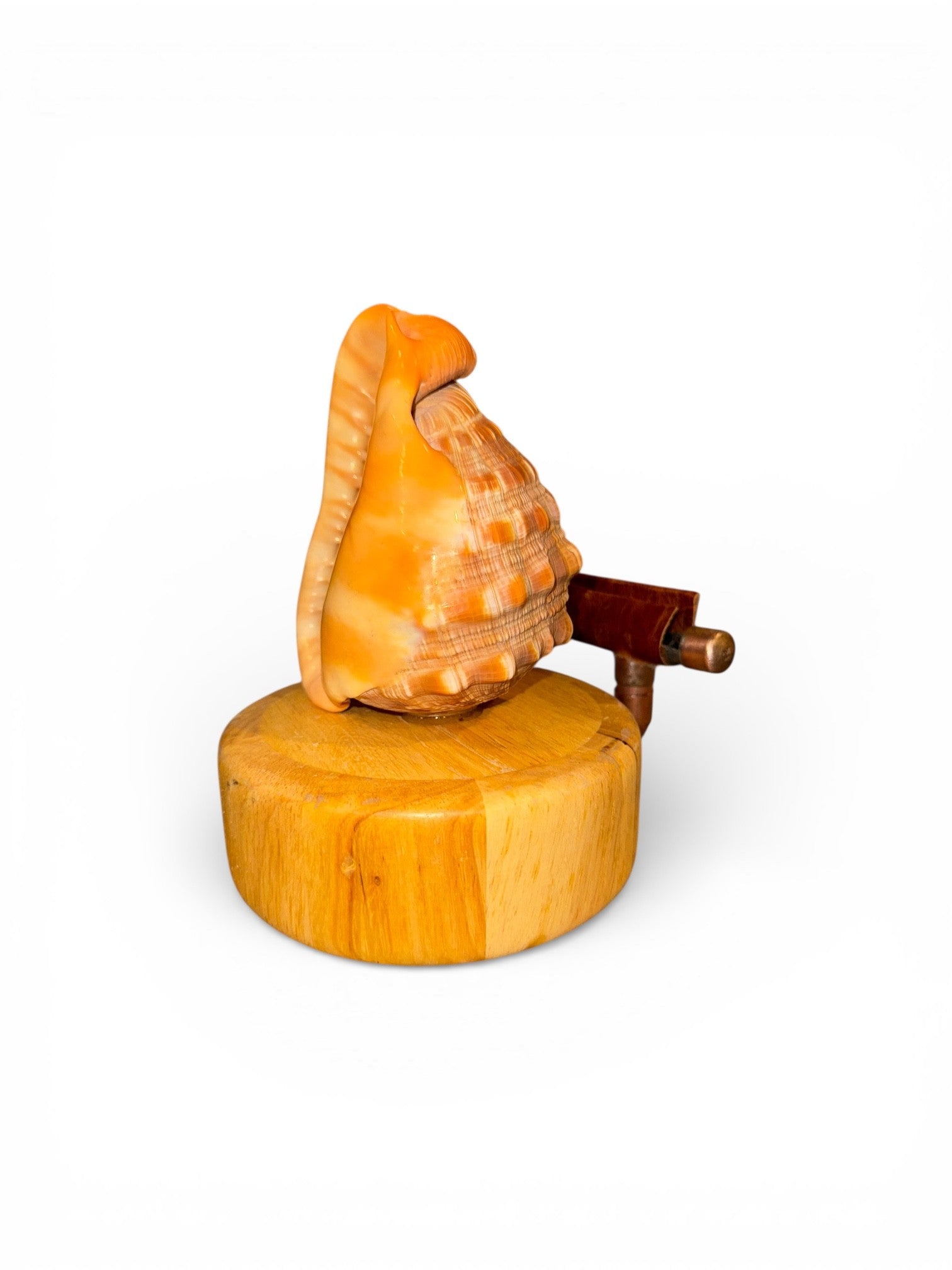 The Helmet Conch iHorn is a beautiful piece combining the elements of the earth and the sea to bring about melodies which are soothing and pleasing to the senses. The Conch shell is from the Florida Keys. The base is a midcentury Japanese bowl. Both maintain their original forms to remind us that nothing can match the marvel and beauty of nature. The Helmet Conch iHorn is voluminous and continuous, like waves lapping at the beach. The Helmet Conch is a pleasure to both listen to and view.