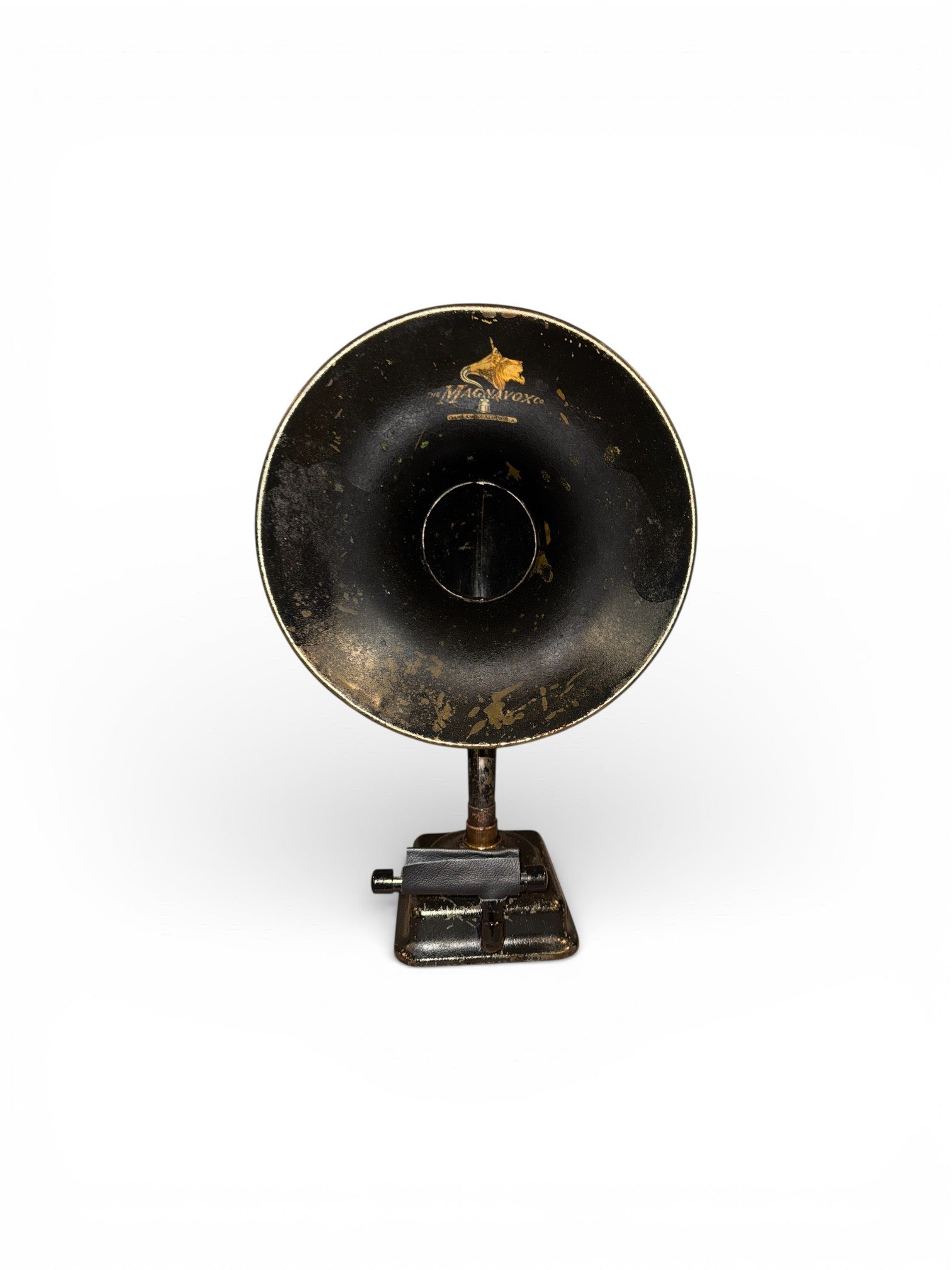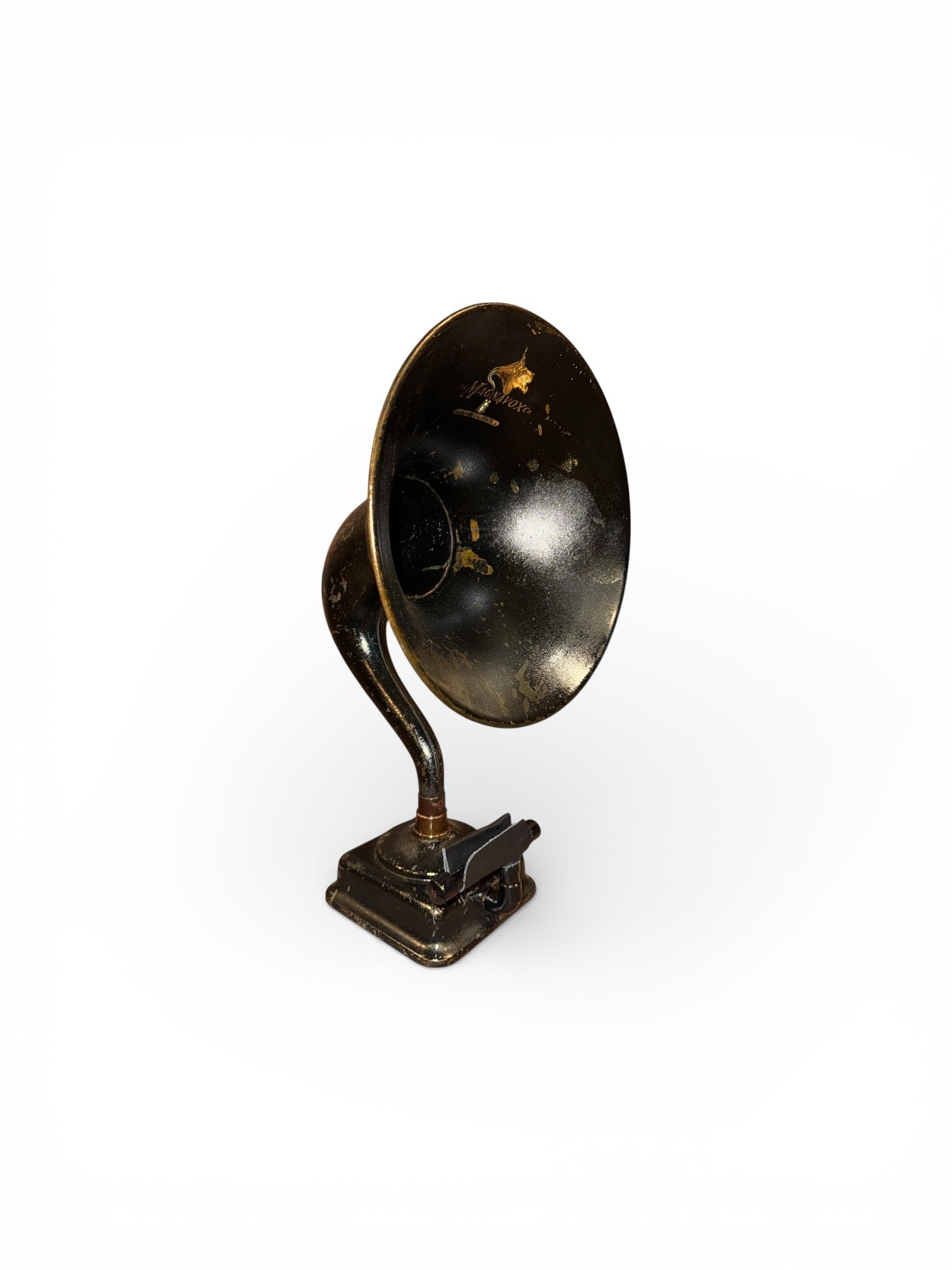 The Magnavox M-4 iHorn is made from a Magnavox Radio Horn which was driven by its M-4 driver. It was made in 1924 and reflects its roaring age. In 1910 Magnavox started as "Commercial Wireless & Development Company" at Napa, California. In 1915, Magnavox put a horn to their "telephone receiver with moving-coil system" and then used it as a "Fog-Horn" for the local baseball park. It was called the “Magna Vox” which was latin for “Great Voice.” In 1917, the Company changed its name to Magnavox. Magnavox introduced its first tube radios in 1920, and continued to manufacture electronics until the 1980’s when it merged with Phillips. Appropriately, the Magnavox logo is the lion head roaring. The M-4 is a product of the roaring twenties. The Roaring 20s was a period of sustained economic prosperity with a distinctive cultural edge in the United States. The decade was known as the Crazy Years. It was an era emphasizing social, artistic and cultural dynamism. Jazz music blossomed, the flapper redefined the modern look for women, and Art Deco peaked. The Magnavox M-4 is a wonderful piece which represents it era to perfection. No longer a youthful flapper, it remains in the height of fashion. So sit back and enjoy a period which revolutionized the world.