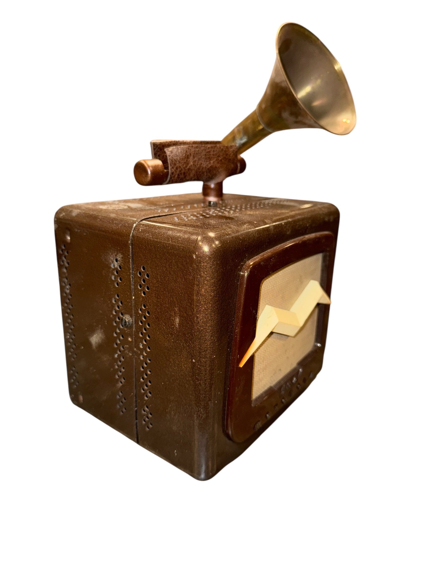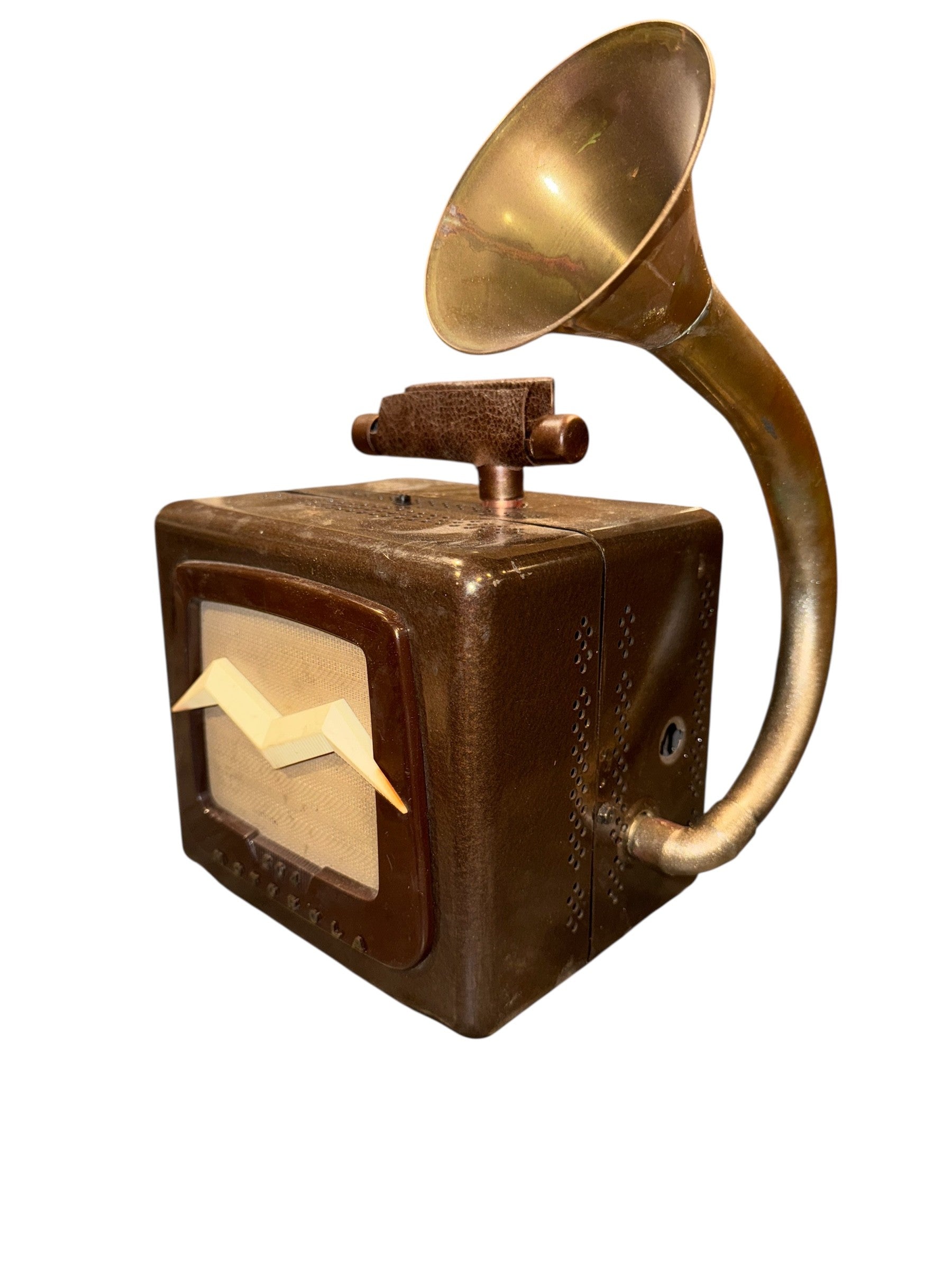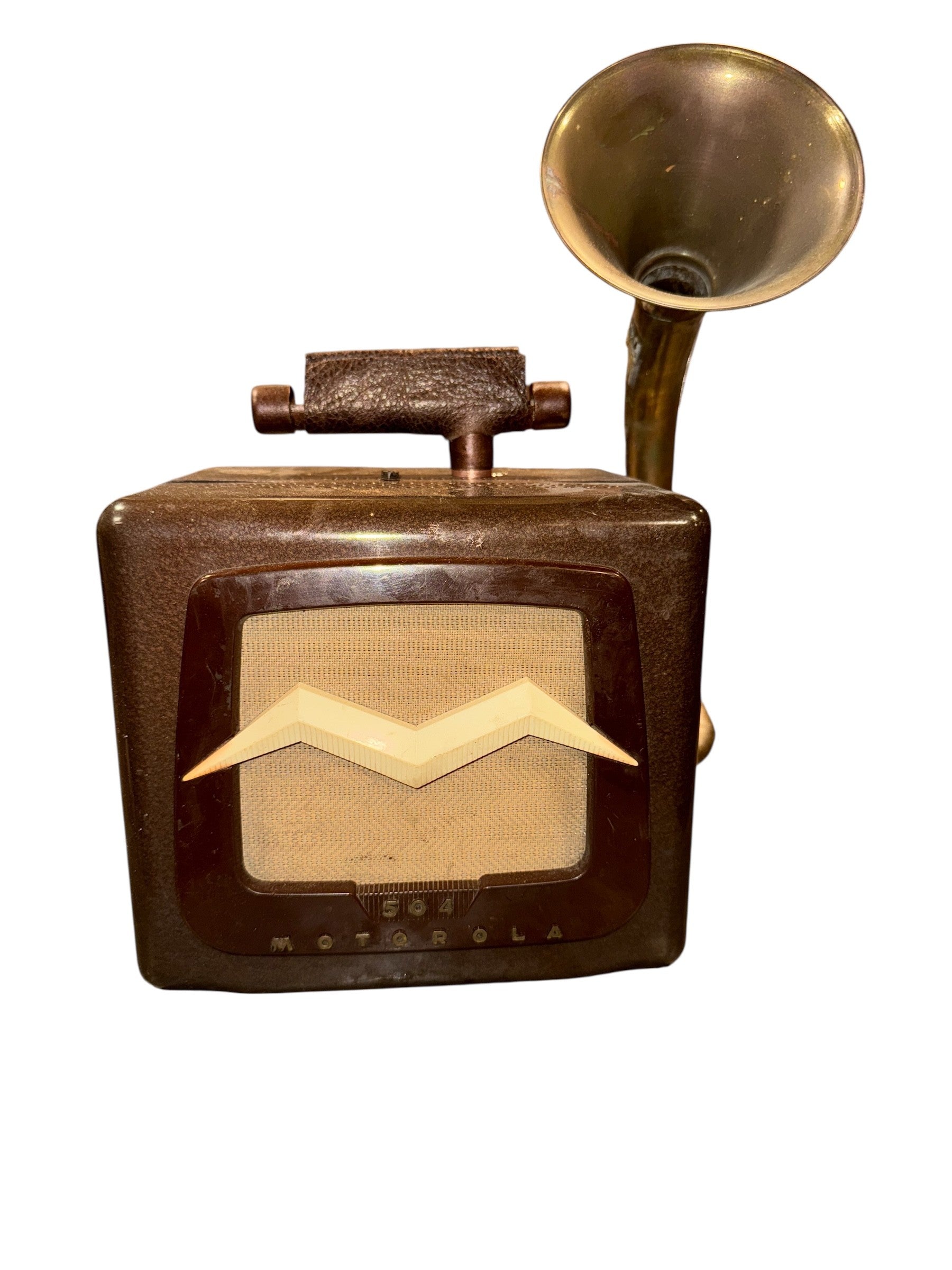 The Motorola 504 iHorn is made from a Motorola 1954 Model 501 car radio and a fox hunting horn. Paul Galvin, owner of Galvin Manufacturing Corporation, a battery manufacturer who made a device that allowed radios to run on household current. In the 1930's the big radio companies all ended in "ola" so Galvin, who was then moving into making automobile radios, changed the name of his company to Motorola. 1950’s was a post World War II explosion of automobile production and sales with almost 58,000,000 automobiles produced and sold, compared to a total U.S. population of only 179, 323,175! Hope and prosperity, combined with sock hops and drive inn movies flourished as America’s passion for life twisted the night away. So, rock the road with The Motorola 504 iHorn!