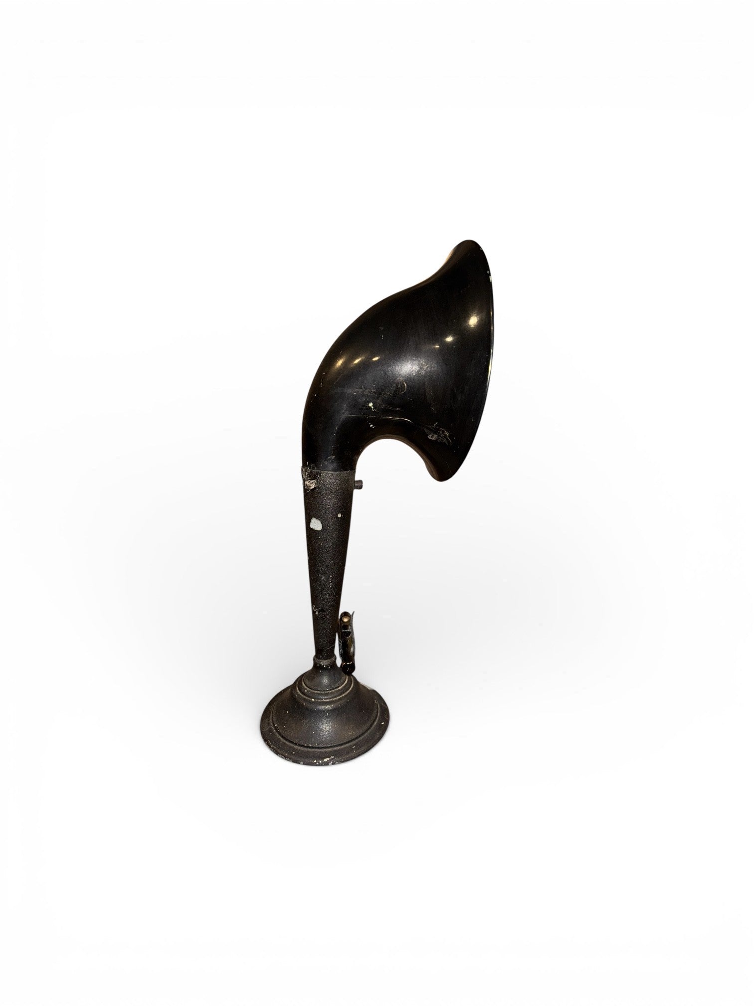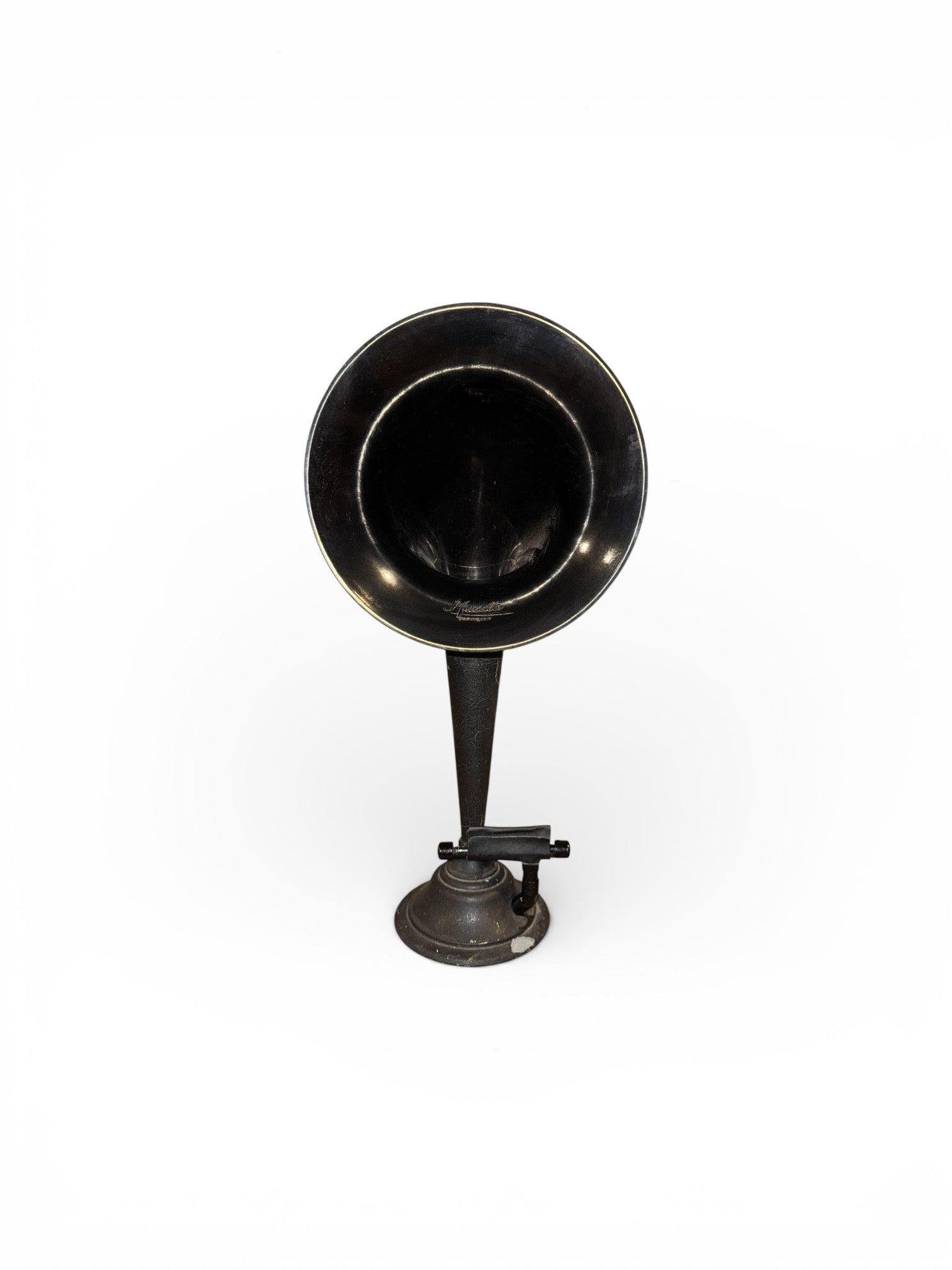 The Musette iHorn is made from a 1925 Herbert H. Frost loudspeaker. Located in Chicago, Herbert H. Frost, Inc. was a diversified company motivated by profit. Frost was best known as the manufacturer and reseller of "Frost Fones" and radio parts like tube sockets and loose couplers in the 1920s. Like so many companies, diversity was the key to longevity, and Frost was not different, holding a subsidy called "Coin Devices Inc." which made and set up coin operated radios in hotels. Frost was so good at marketing that his company was retained in 1932 as the sales division of "CTSC" Chicago Telephone Supply Co. selling their potentiometers. The Musette iHorn is sassy and stylish. It is beautiful and functional. It defined an era.