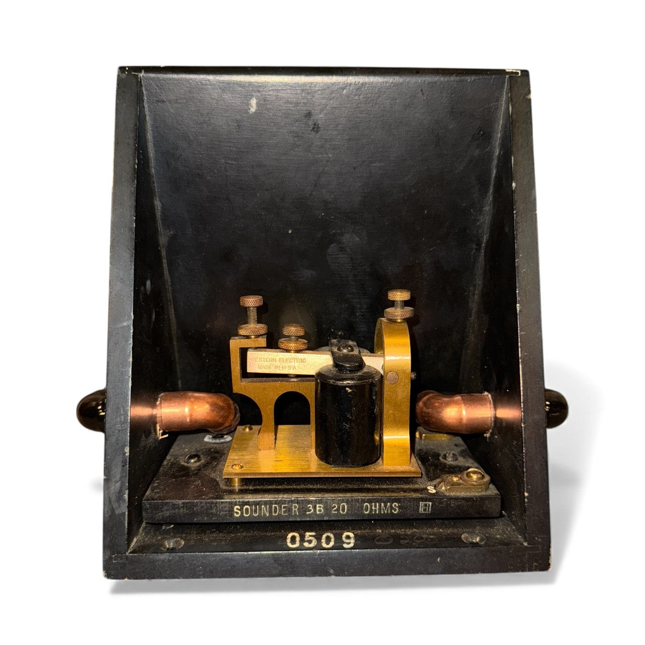 The Resonator iHorn is made from an antique telegraph sounder and resonator box. Its purpose was to amplify the morse code so that the operator could more easily decipher the code to transcribe the message accurately. It was made in the mid to late 1800s. Developed in the 1830s and 1840s by Samuel Morse (1791-1872) and other inventors, the telegraph revolutionized long-distance communication. It worked by transmitting electrical signals over a wire laid between stations. In addition to helping invent the telegraph, Samuel Morse developed a code (bearing his name) that assigned a set of dots and dashes to each letter of the English alphabet and allowed for the simple transmission of complex messages across telegraph lines. On May 24, 1844, Morse sent his first telegraph message, from Washington, D.C., to Baltimore, Maryland a distance of 38 miles, stating, “What hath God wrought!” Suddenly, communication could occur from distance. By 1866, a telegraph line had been laid across the Atlantic Ocean from the U.S. to Europe. Although the telegraph had fallen out of widespread use by the start of the 21st century, replaced by the telephone, it laid the groundwork for the communications revolution that led to those later innovations. The electric telegraph transformed how wars were fought and won and how journalists and newspapers conducted business. The telegraph also had a profound economic effect, allowing money to be “wired” across great distances. The Resonator iHorn represents the first text messaging device and the movement of communication which is today taken for granted.
