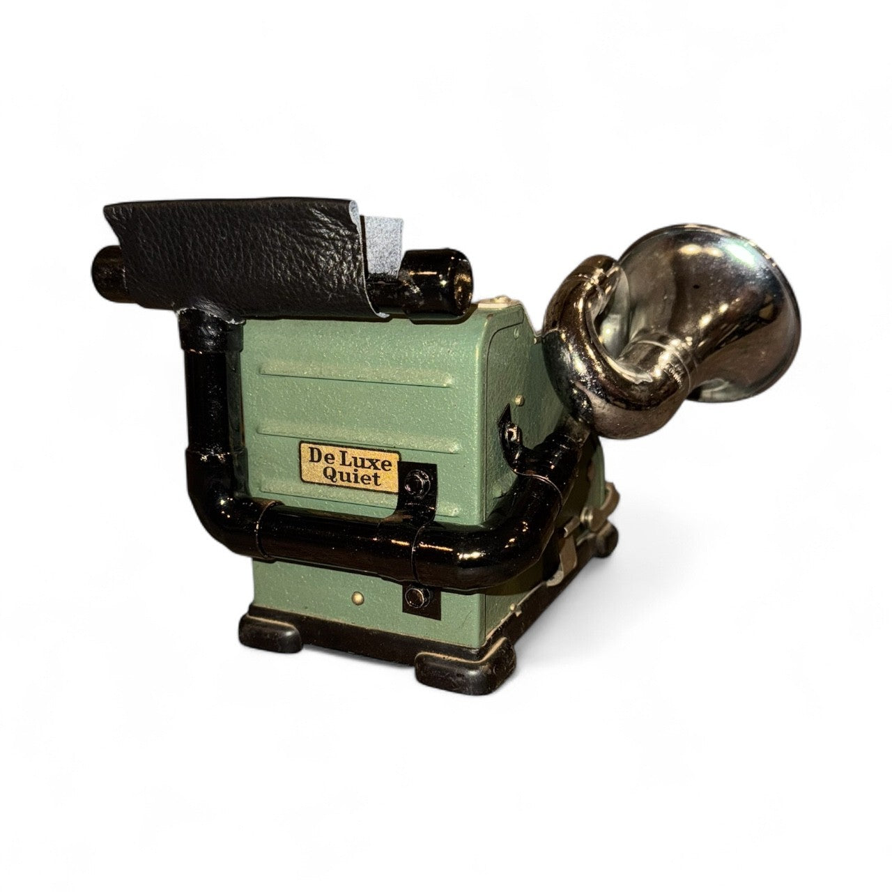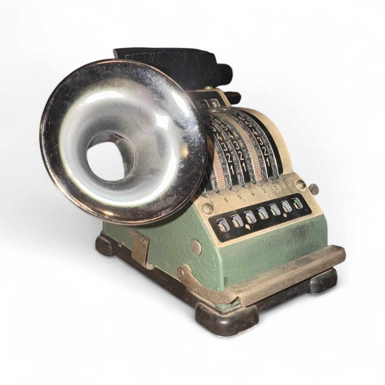 The Resulta 7 iHORN is made from a German disk calculator, or adding machine, made in the 1950’s coupled with a vintage Condor bulb bicycle horn made in 1940. An adding machine is a perfect gift for a mother or accountant. For the accountant, it all adds up, but for a mother because her love is selflessly synergistic, making the sum of the whole greater than the individual parts.