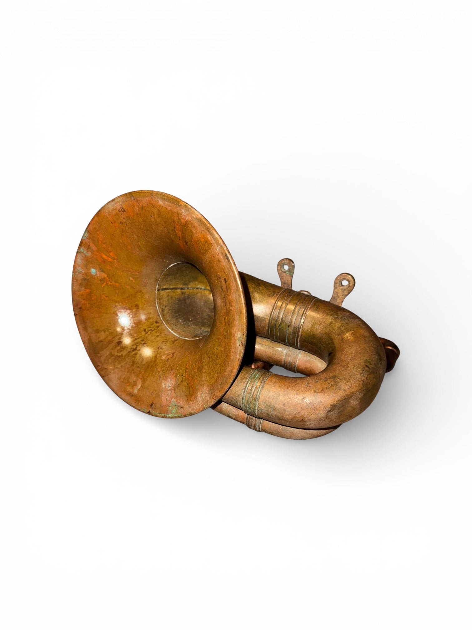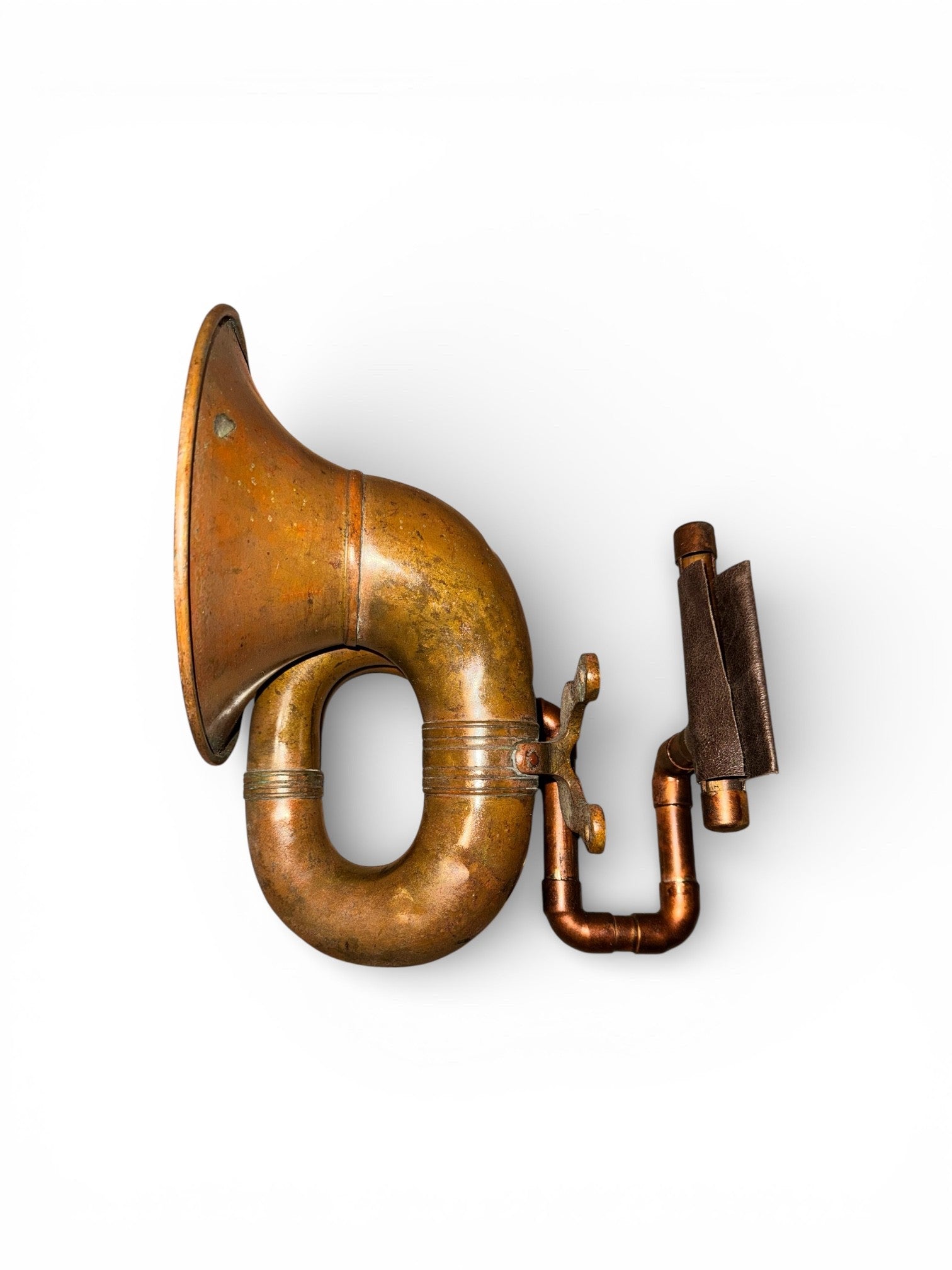 The Round Rubes iHORN is made from a brass Rubes horn which was mounted on a Model T. The round shaped horns are early wth mounting bracket which bolted to the firewall indicates that the horn was made between 1914 and 1915. The Rubes horn was connected to a bulb which was inside the cab of the Model T and was squeezed to emit the horn noise. As originally constructed, the opening of the horn had a screen which kept foreign particles from entering the horn. Rubes horns are highly collectible and valued in the vintage automobile collector market. The Round Rubes iHorn is part of the industrial revolution and early Americana. It is historic in the manner in which it contributed to the automotive experience.