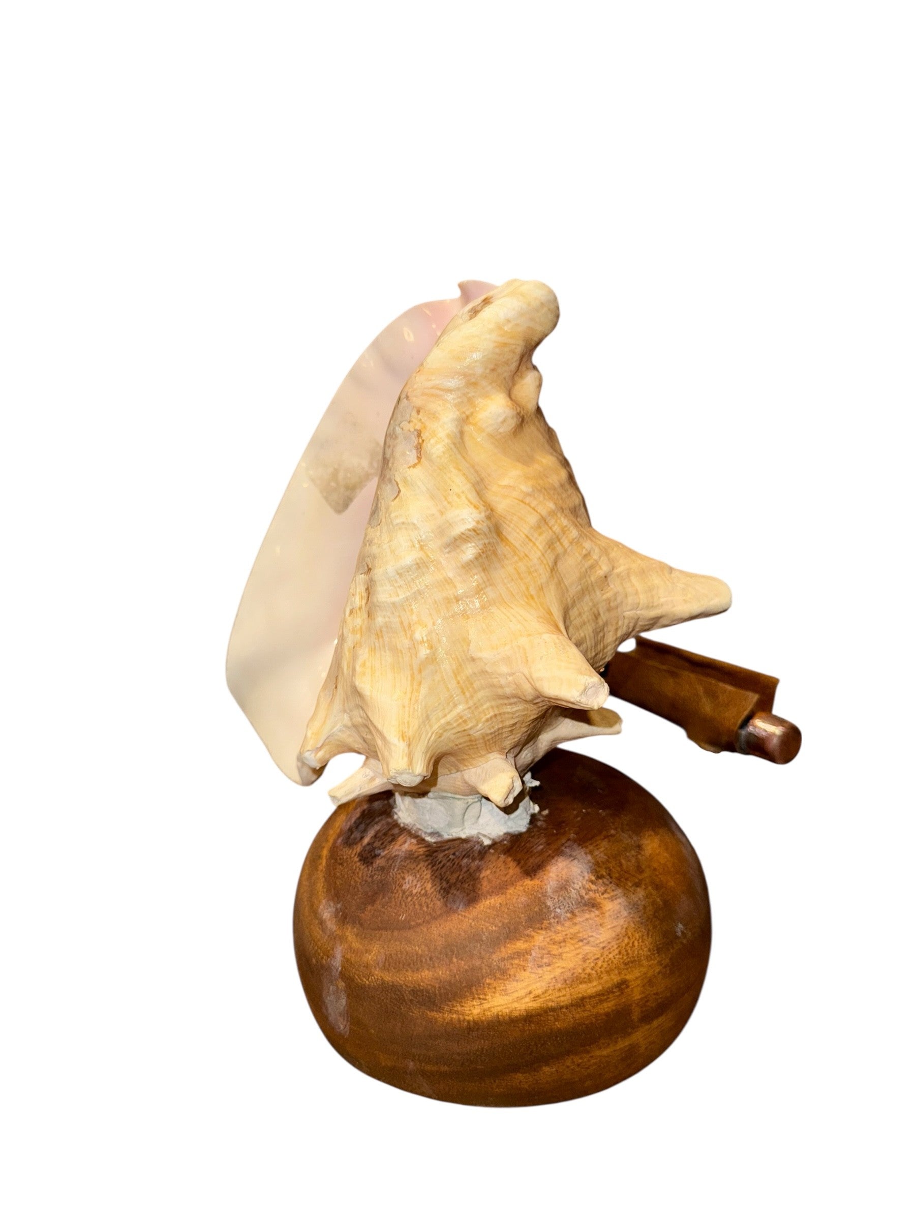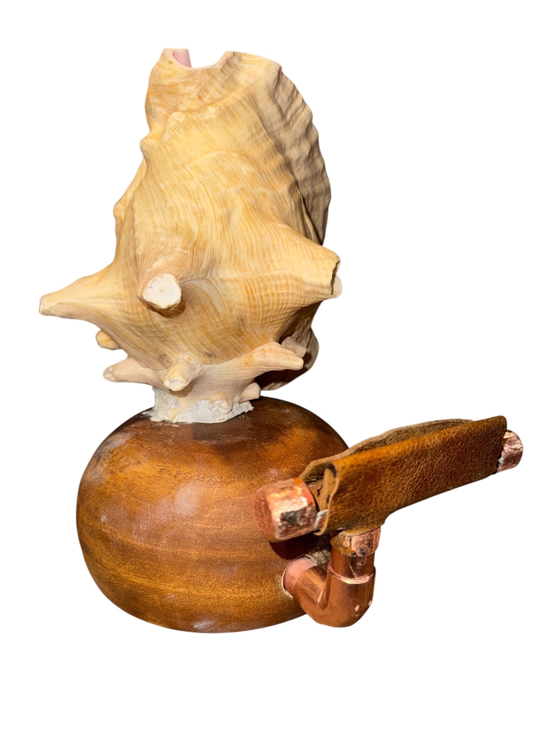 The Conch iHorn is a beautiful piece combining the elements of the earth and the sea to bring about melodies which are soothing and pleasing to the senses. The Conch shell is from the Florida Keys. The base is a midcentury Japanese bowl. Both maintain their original forms to remind us that nothing can match the marvel and beauty of nature. The Conch iHorn is voluminous and continuous, like waves lapping at the beach. The Conch is a pleasure to both listen to and view.