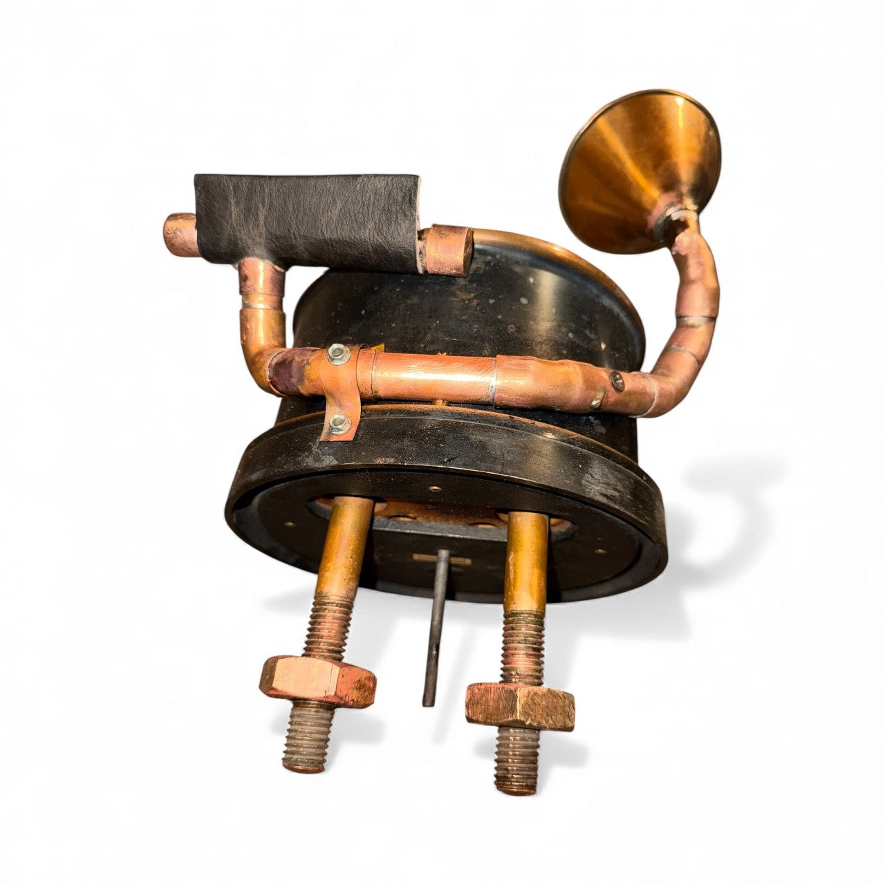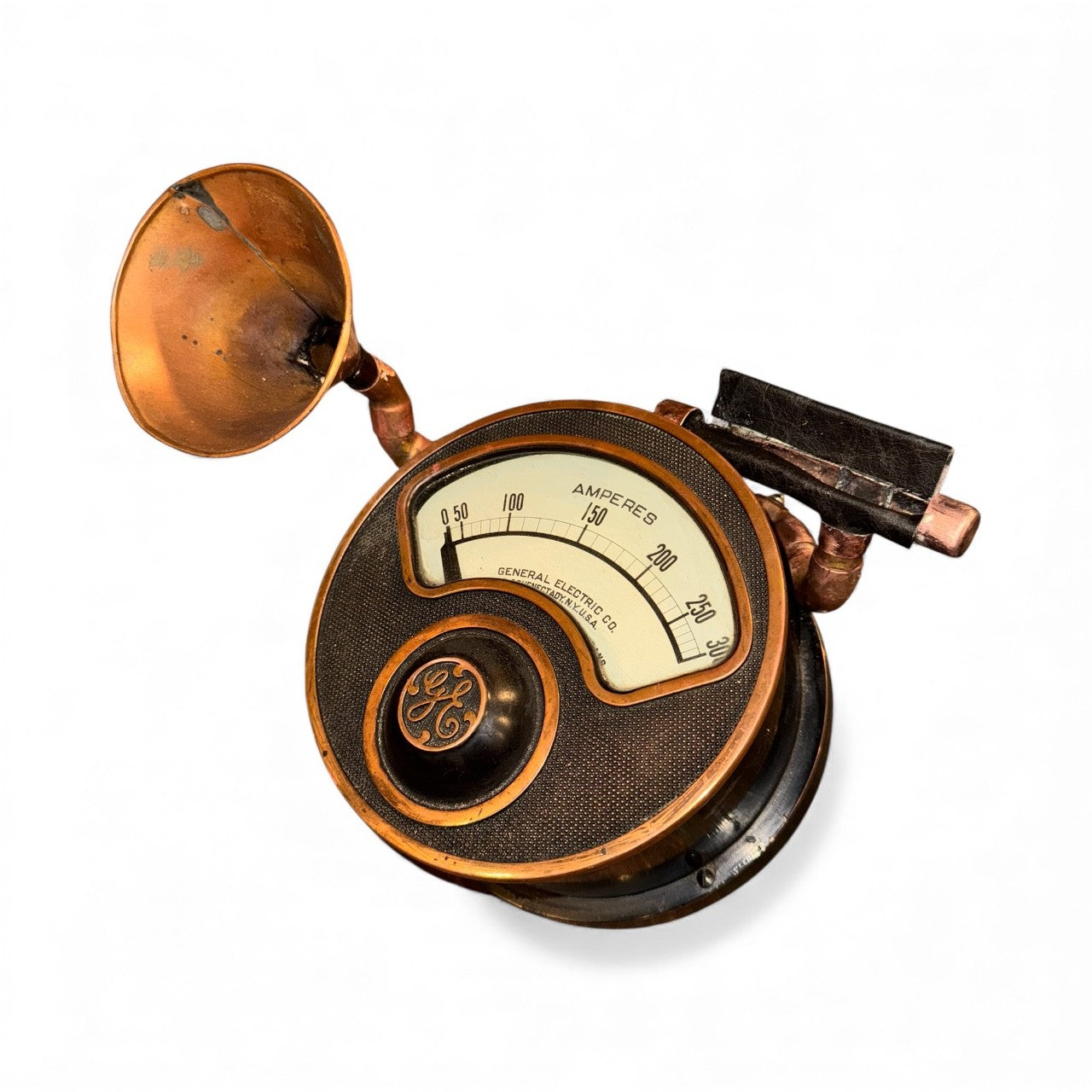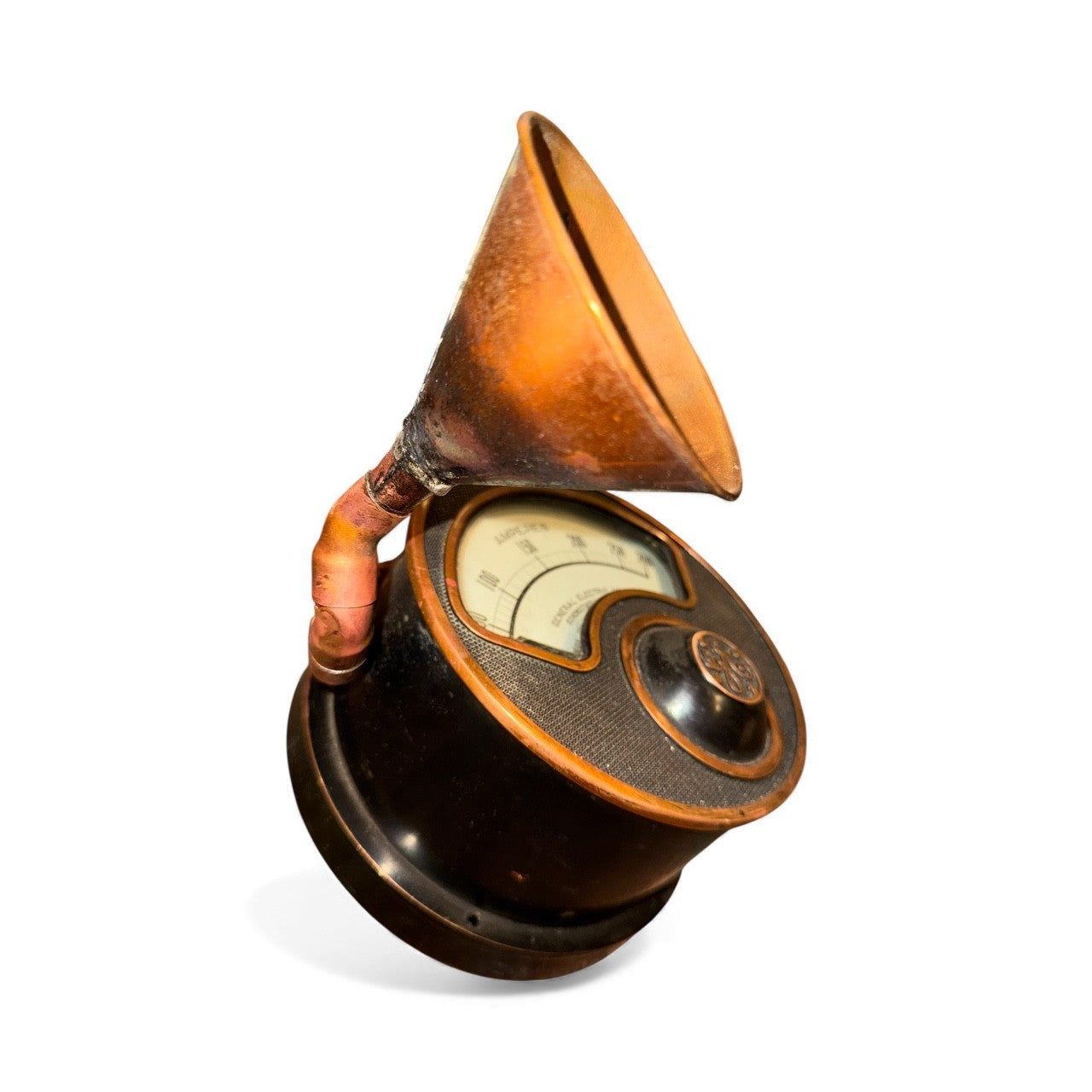 The General Electric Voltmeter iHorn is made from a General Electric Company Voltmeter. The visible patent marks date it to approximately 1901. It is an immaculately beautiful tool used as a measuring instrument used to measure the current in a circuit. Electric currents are measured in amperes. By the late 19th century, improved instruments were designed which could be mounted in any position and allowed accurate measurements in electric power systems. The General Electric Voltmeter iHorn uses a small copper funnel as the horn and is simply a gorgeous example of quality workmanship as a tool of the trade which reminds us that the world is a laboratory of fascination.