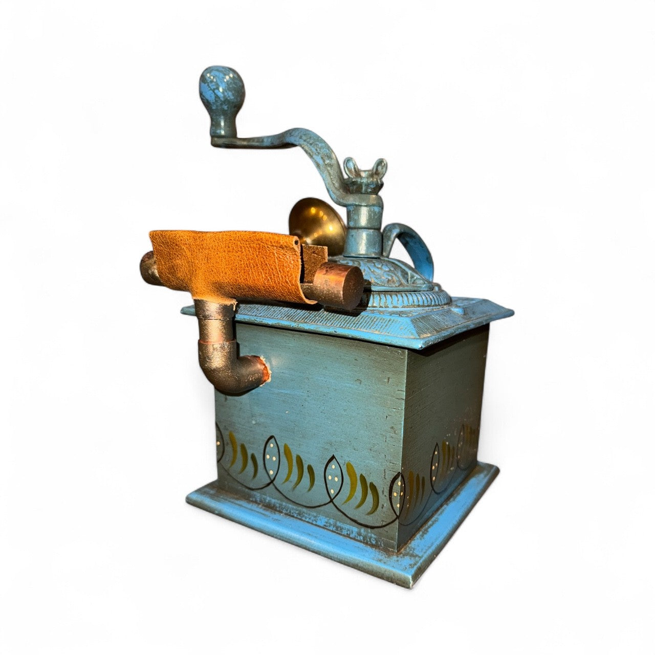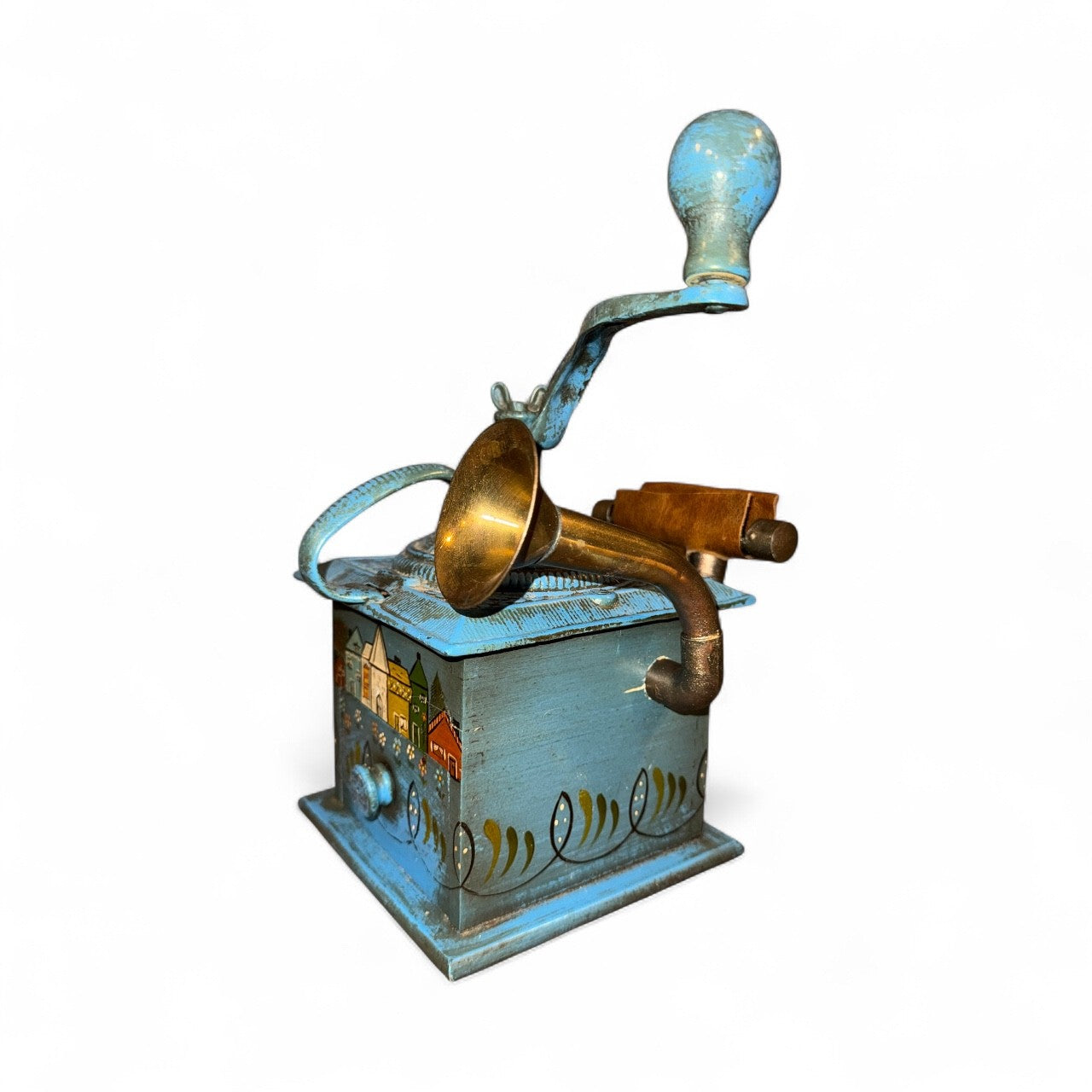 The Grinder iHorn is made from an antique Coffee Grinder and antique funnel. Legend has it that coffee was discovered by a Goat herder in Ethiopia prior to the 15th Century. Its cultivation and commercial trade began on the Arabian Peninsula. By the 16th Century coffee was known in Arabia, Persia, Egypt, Syria and Turkey. By the 17th Century, it had made its way to Europe. The Dutch brought coffee to “New Amsterdam” nka New York by the mid-1600’s. It was a bean on the move.Coffee remains today huge business. It is forecasted that by 2025, worldwide coffee with be a $64,820,000,000.00 industry. People like a cup’o’joe. Believe what you want, the best part of waking up appears to be coffee in your cup! So while you are enjoying your morning brew, do so while listening to the creamy sounds of The Grinder iHorn.
