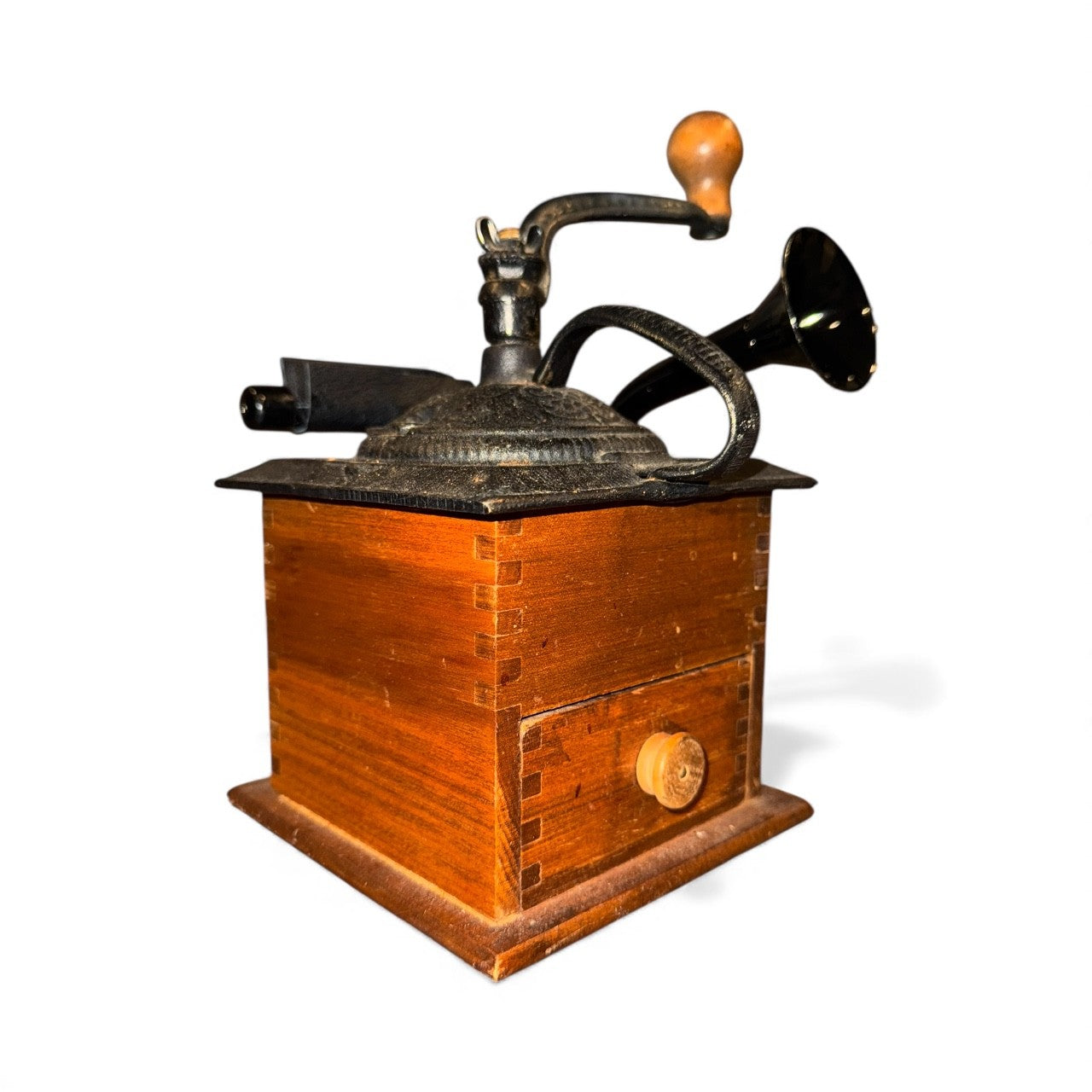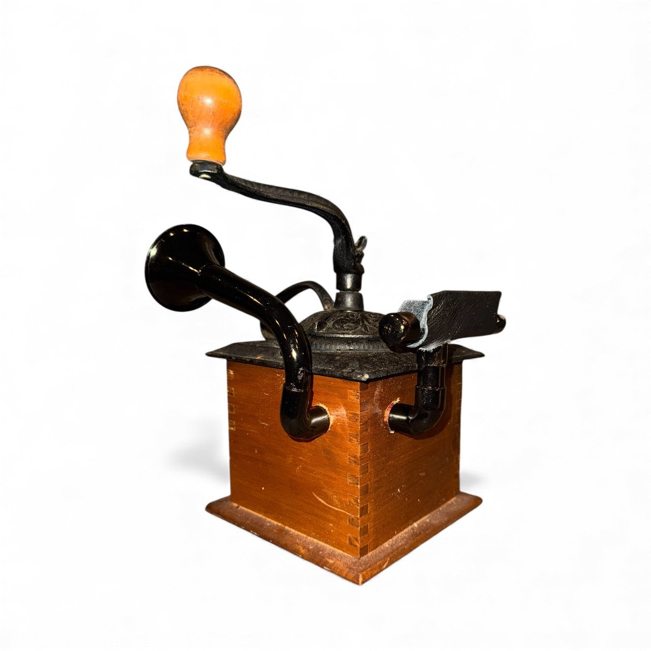 The Grinder iHorn is made from an antique Coffee Grinder and antique funnel. Legend has it that coffee was discovered by a Goat herder in Ethiopia prior to the 15th Century. Its cultivation and commercial trade began on the Arabian Peninsula. By the 16th Century coffee was known in Arabia, Persia, Egypt, Syria and Turkey. By the 17th Century, it had made its way to Europe. The Dutch brought coffee to “New Amsterdam” nka New York by the mid-1600’s. It was a bean on the move.Coffee remains today huge business. It is forecasted that by 2025, worldwide coffee with be a $64,820,000,000.00 industry. People like a cup’o’joe. Believe what you want, the best part of waking up appears to be coffee in your cup! So while you are enjoying your morning brew, do so while listening to the creamy sounds of The Grinder iHorn.