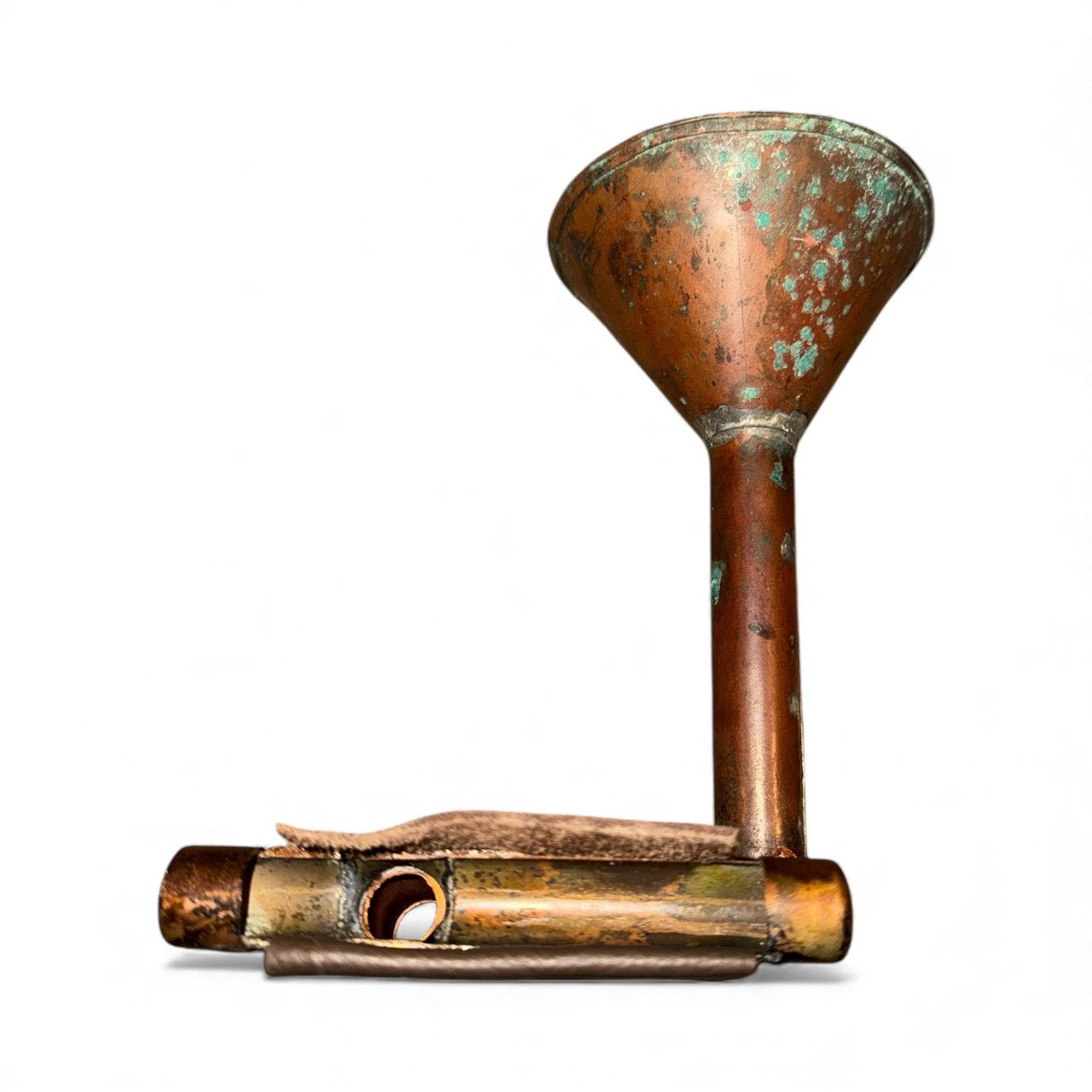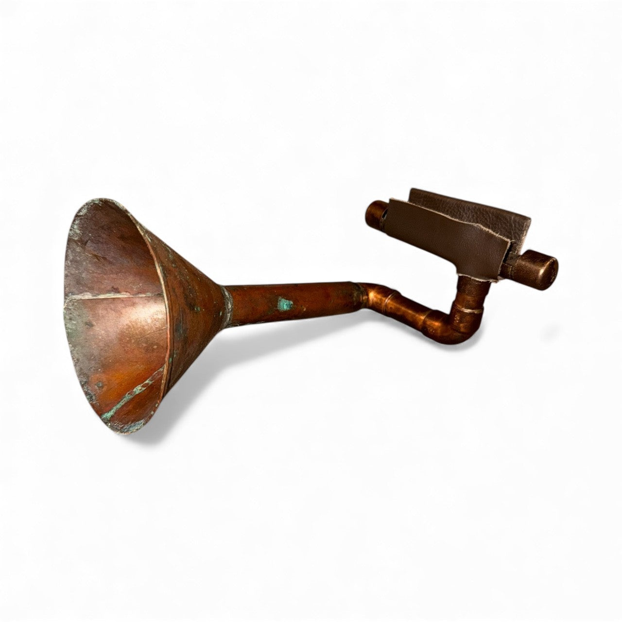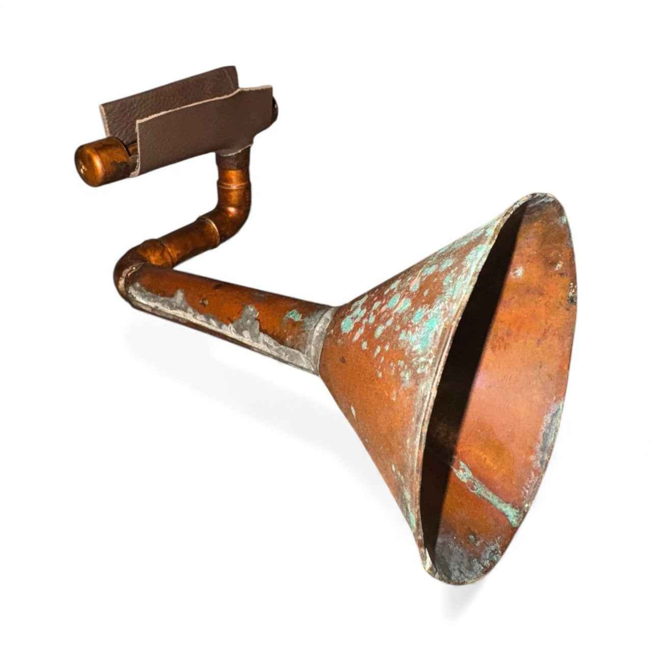 The Patina iHorn is made from a hand made antique copper funnel, probably from the prohibition era. Copper funnels were used as part of the still in the manufacture of illegal alcohol when our government decided it was prudent to legislate morality, an experiment gone awry. The Patina iHorn is a simple yet effective tool, its patina and functionality work as well today as when it was first made. Regardless of its age, The Patina iHorn is remarkable in simplicity and grace.