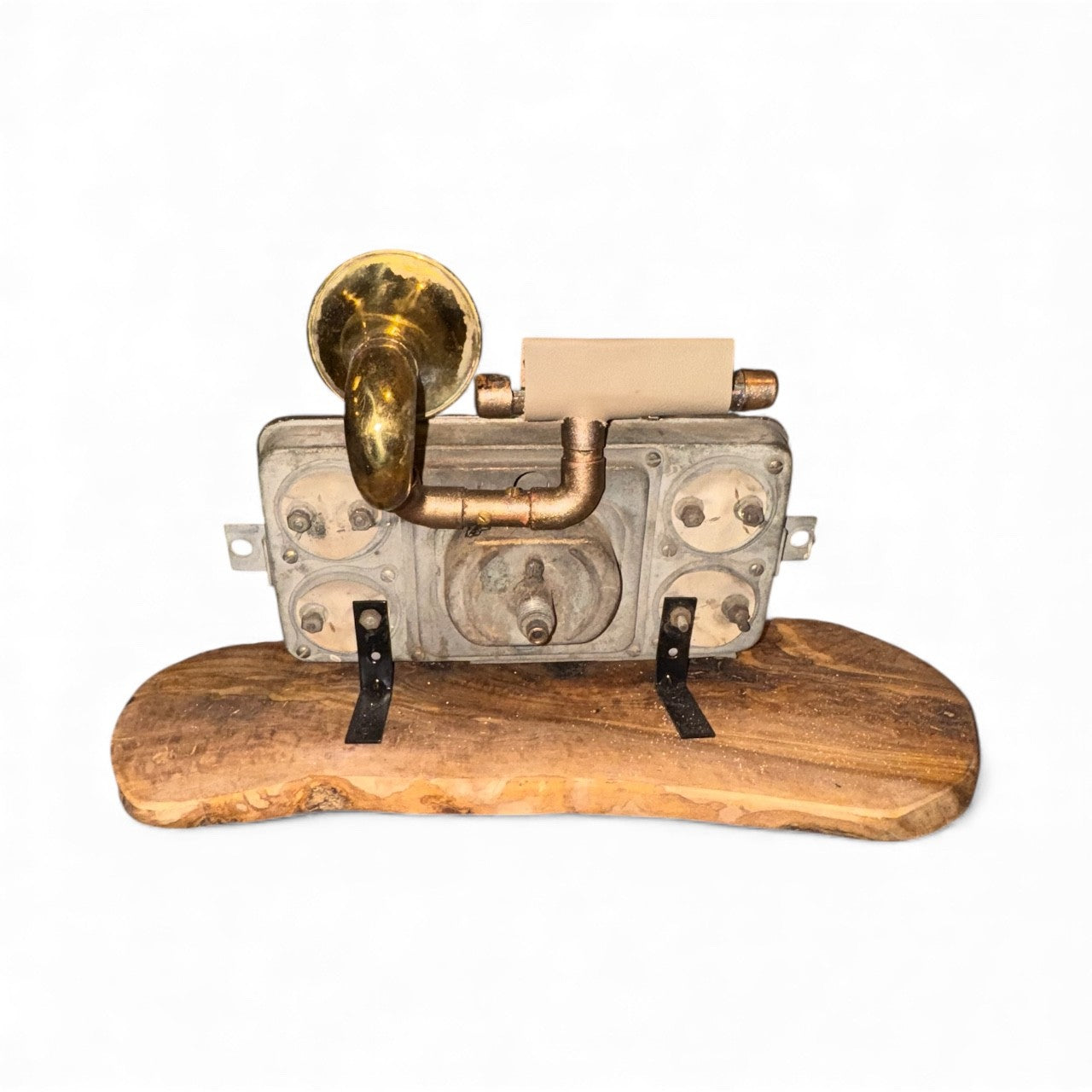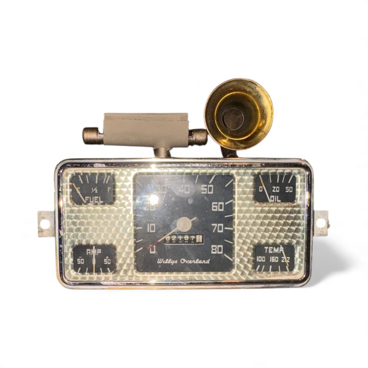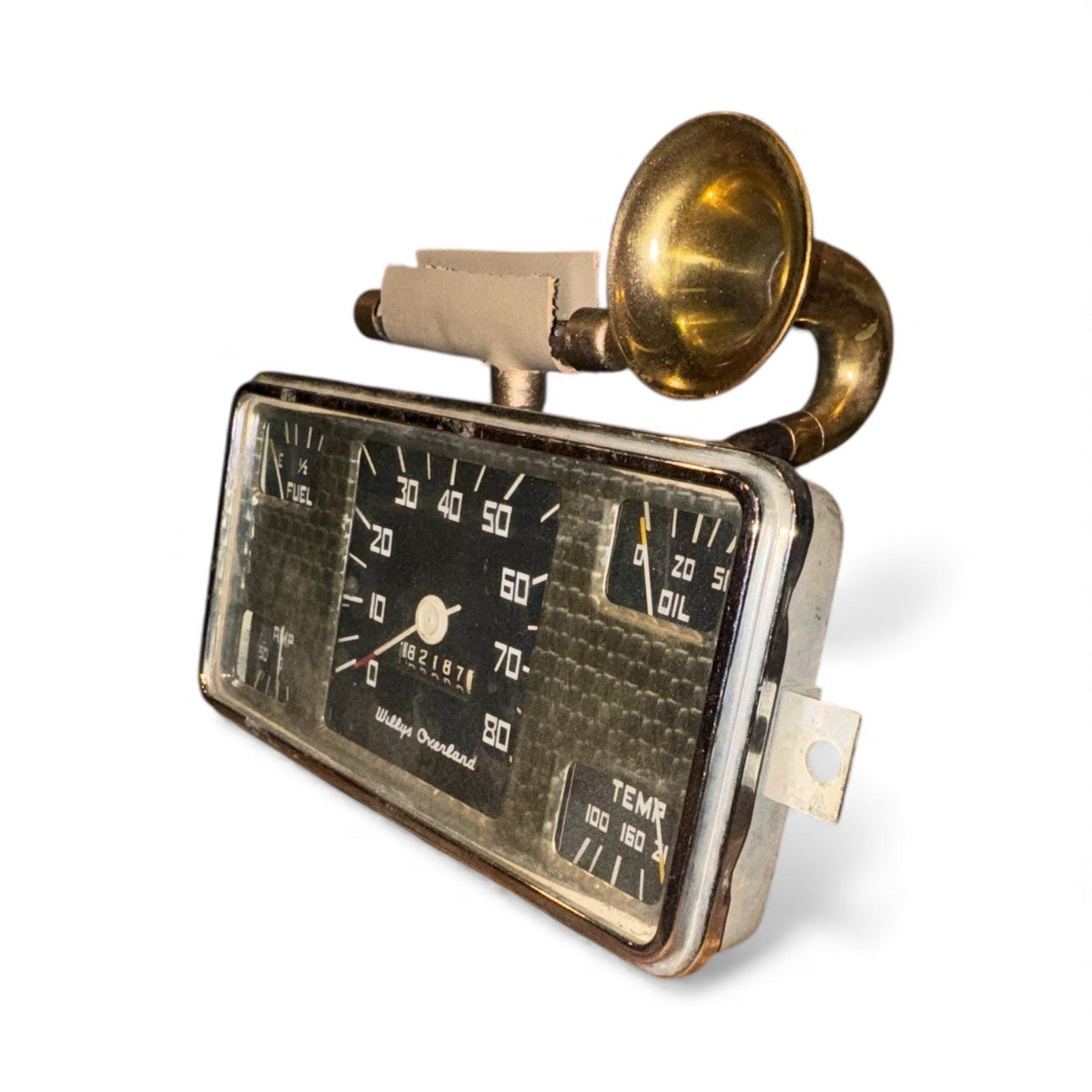 The Willy’s Overland iHORN is made from a 1948 Willy’s Overland instrument cluster coupled with a small condor bike horn. It is a uniquely special piece made with the Jeep lover in mind. In 1908, John Willys bought the Overland Automotive Division of Standard Wheel Company and in 1912 renamed it Willys–Overland Motor Company. From 1912 to 1918, Willys was the second-largest producer of automobiles in the United States after Ford Motor Company. Willys–Overland was one of two bidders when the United States Army sought an automaker that could begin rapid production of a lightweight reconnaissance car. Production of the Willys MB, better known as Jeep, began in 1941. In total 653,568 military Jeeps were manufactured. The origin of the name "Jeep" has been debated for many years. Some people believe "jeep" is a phonetic pronunciation of the abbreviation GP, from "General Purpose." The first documented use of the word "Jeep" was the name of a character Eugene the Jeep in the Popeye comic strip. Whatever the source, the name stuck. The Willy’s Overland iHorn is an iconic symbol of American ingenuity and strength. Whether you stay on the black top, or crawl all over impassible rocks, don’t expect everyone to understand, because after all, it’s a Jeep thing! [NOTE: While the first two photos do not depict it, the instrument cluster is mounted on a wood base as shown in the third photograph]