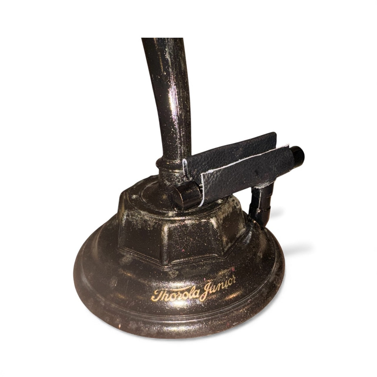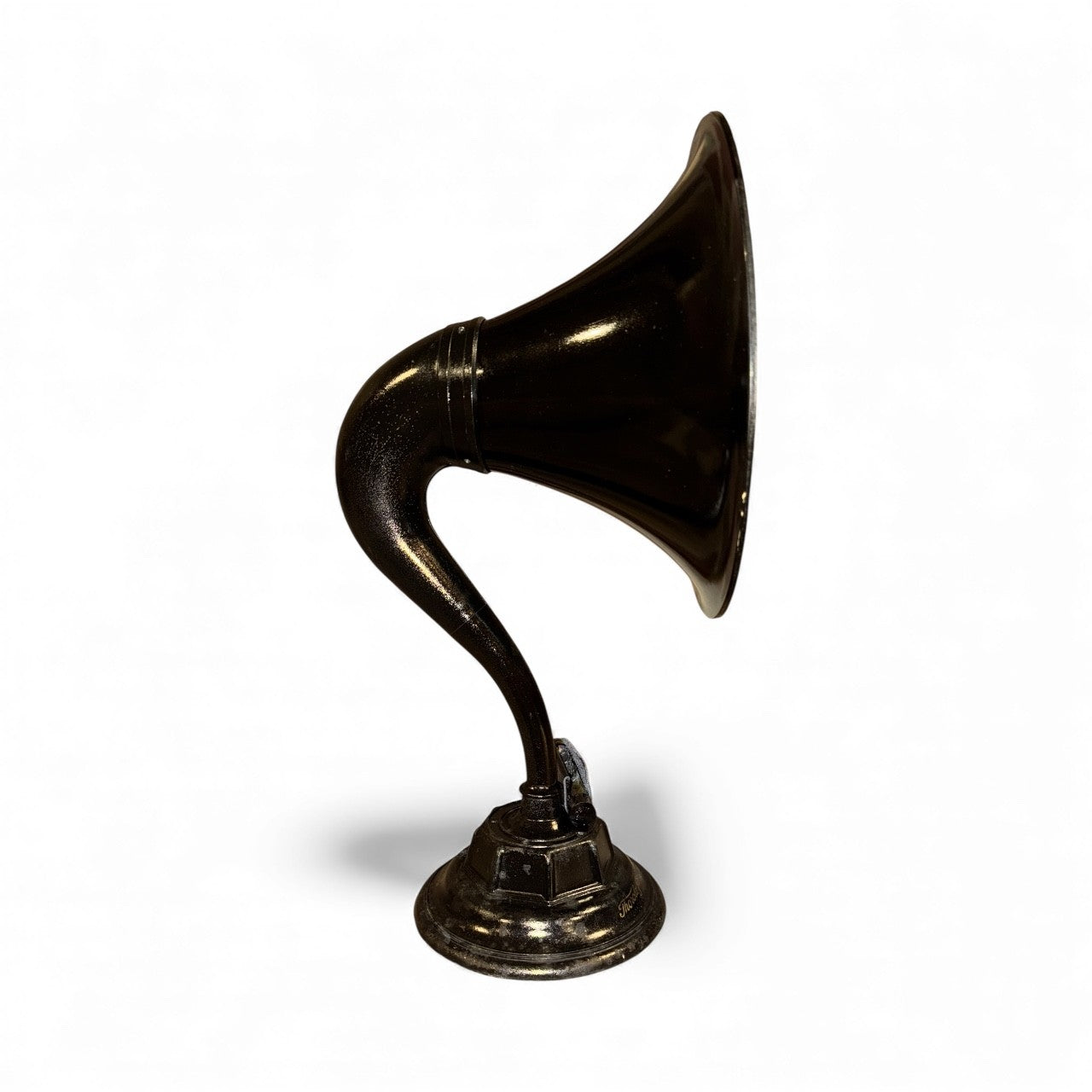The Thorola Junior iHorn is made from a Reichmann Company Thorola Junior No. 12 radio horn which was made in 1923. The horn is bakelite, as are both the gooseneck and base. When it originally sold, its selling price was $15.00. Adjusted for inflation, today it would equate to $212.00 with a cumulative inflation rate of approximately 1,312%. Junior horns were smaller, taking less space, and in fact are far more collectible and rare than larger horns. The Winkler-Reichmann Co., was located in Chicago, Illinois. The late 20’s were a rough time in the radio and speaker markets and Winkler-Reichmann which changed its name to the Reichmann Company in August of 1924 experienced declining sales and economic ruin. It filed for bankruptcy on July 27, 1927, disappearing altogether shortly thereafter. The company’s run was short making their horns considerably rare. The Thorola Junior iHorn is a beautiful piece of art deco which performs smoothly and loudly.
