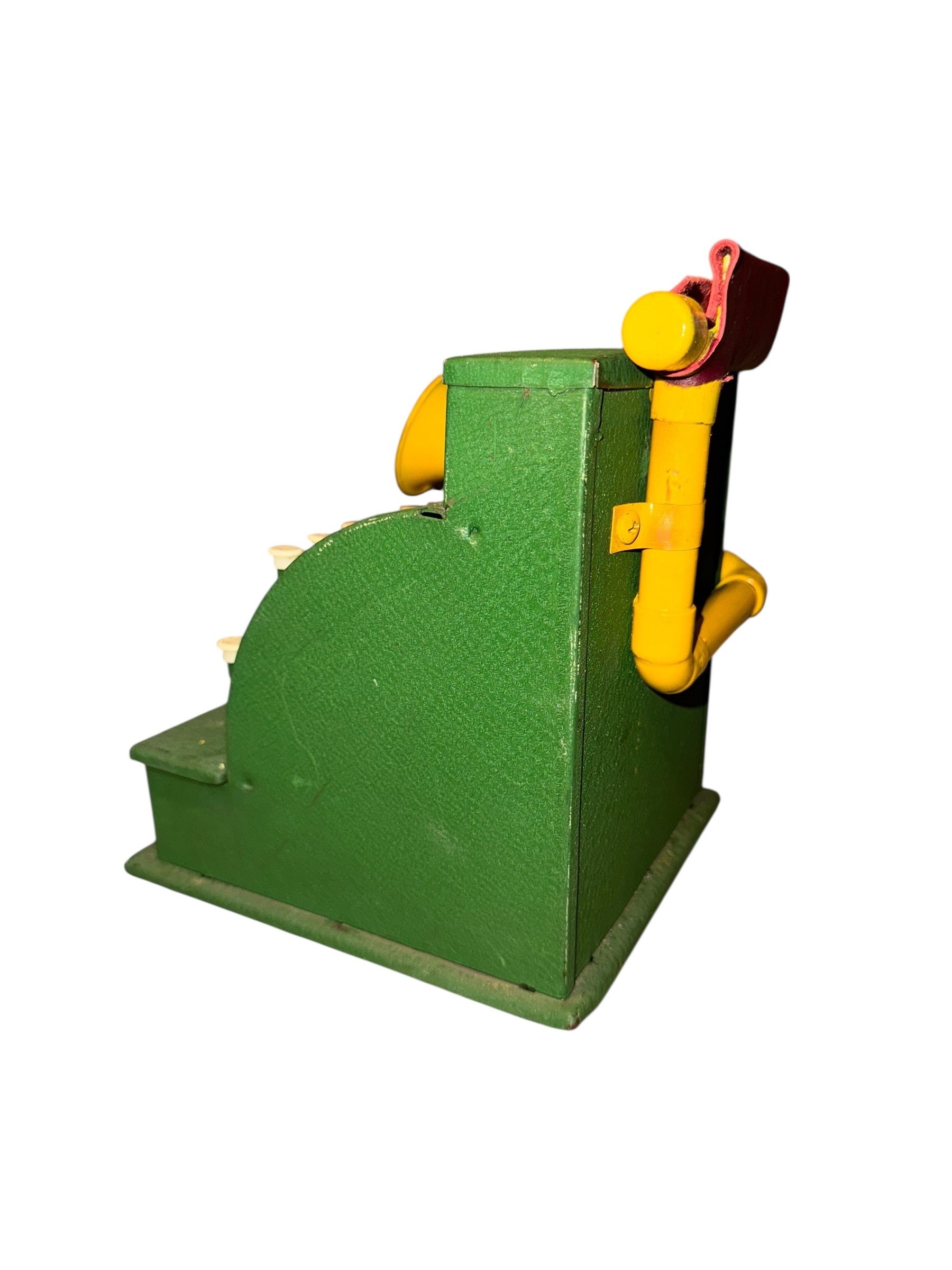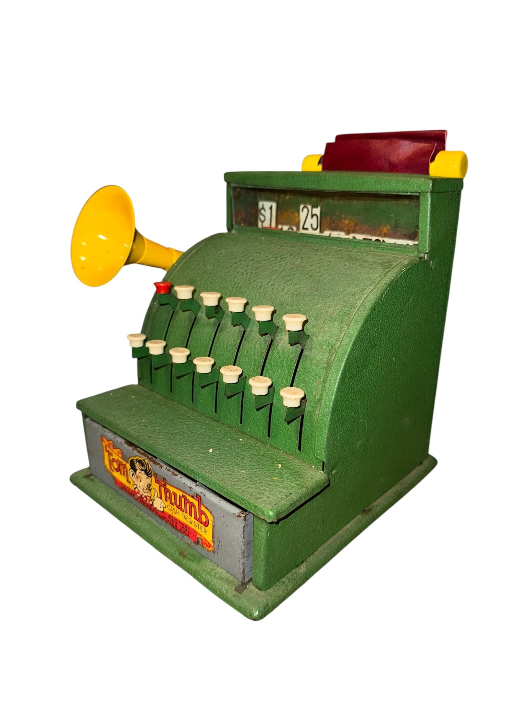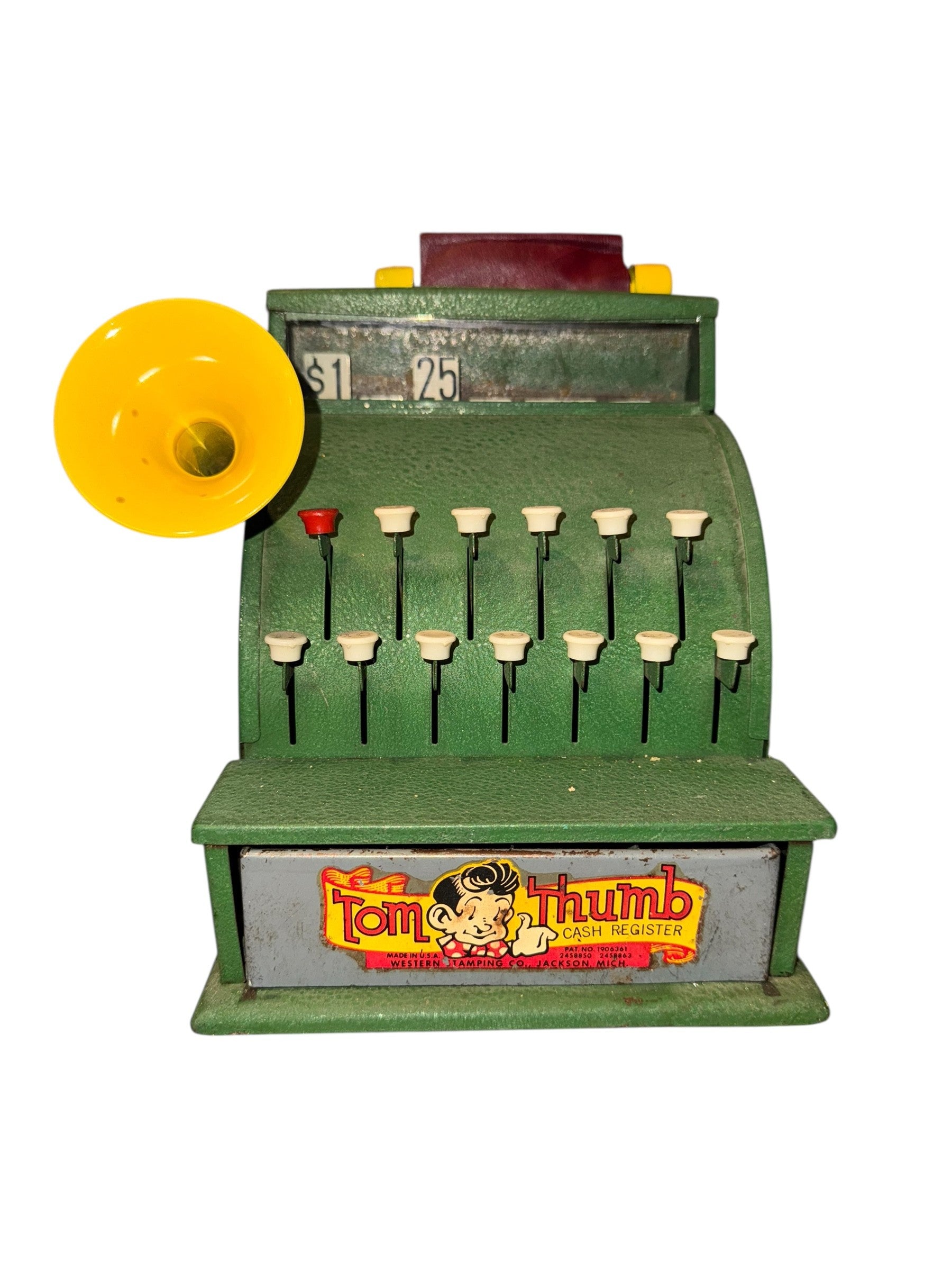 The Tom Thumb iHORN is made from a child’s Tom Thumb cash register toy. Released in the 1950s from Western Stamping Co. of Jackson, Michigan, the Tom Thumb Cash Register allowed children to play cashier and tabulate pretend sales transactions. Tinplate was used in the manufacture of toys beginning in the mid-19th century. The invention of sheet metal stamping machines in 1815 allowed for the mass production of inexpensive toys. Tin toys were made from thin sheets of steel plated with tin, hence the name tinplate. Tin toys were a cheap and durable substitute for wooden toys. The production of tin toys stopped during World War II because of the absence of raw materials, and by the 1960s most tin toy manufacturing had stopped with the advent of cheaper and safer materials from which toys could be made. The Tom Thumb iHorn reveals the truth that frequently child’s play emulates adult behavior. So if you play store, you need a cash register. The Tom Thumb is a reminder for all of us to mindful because the next generation is watching and learning from our examples.