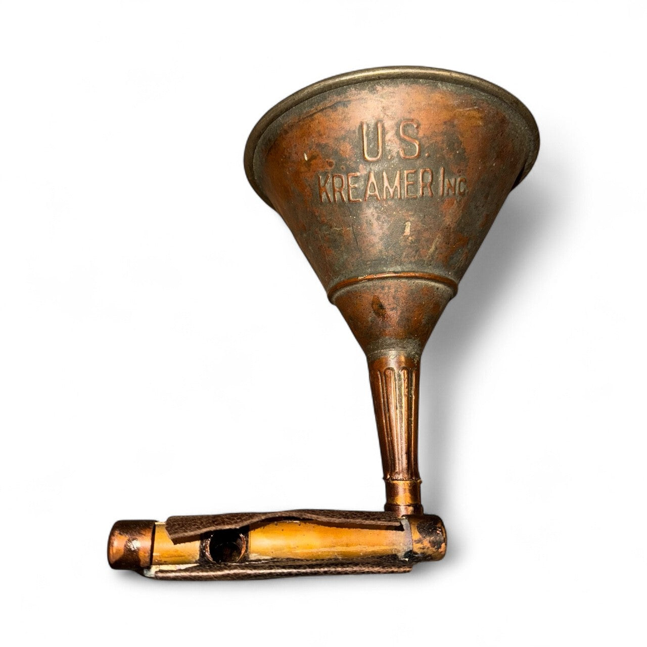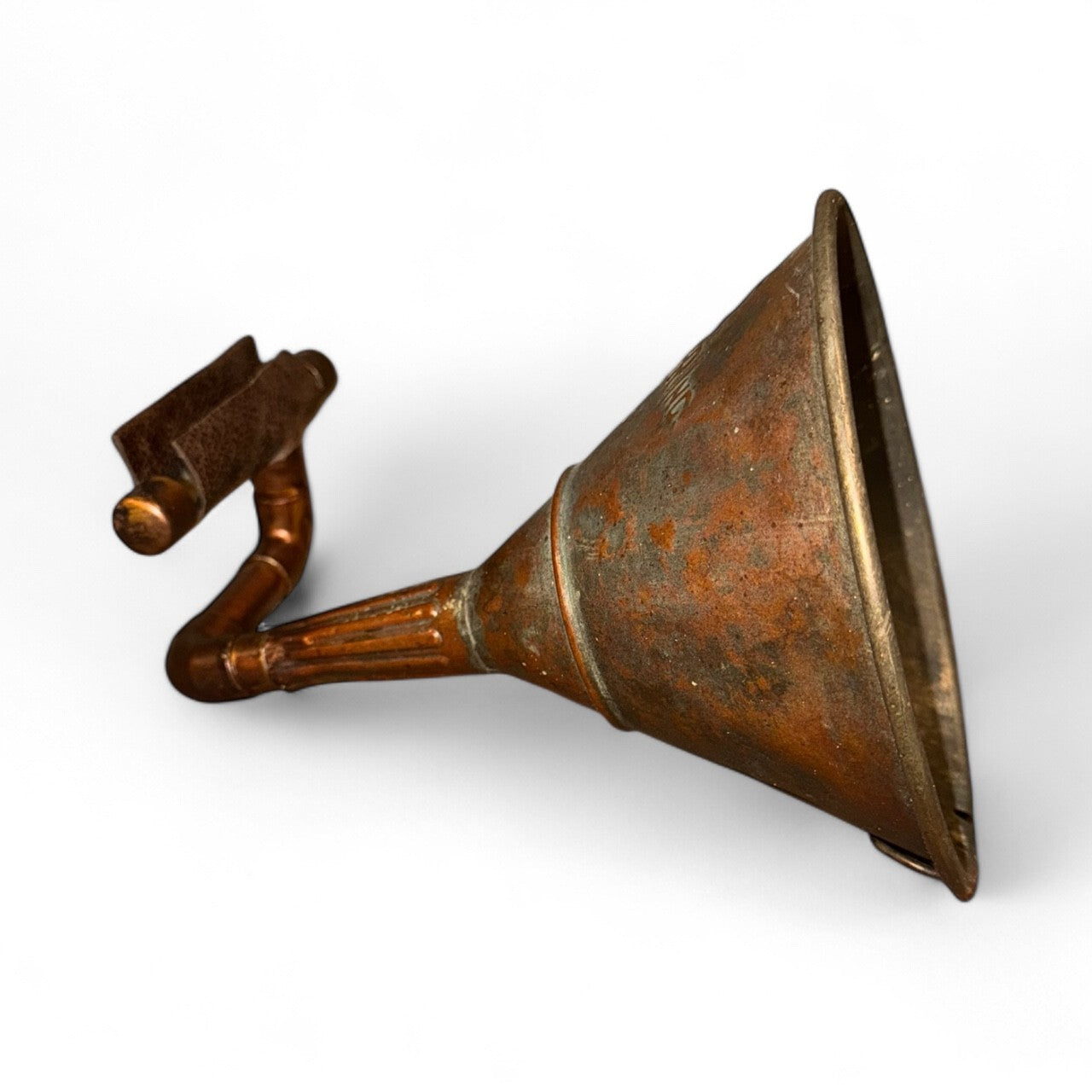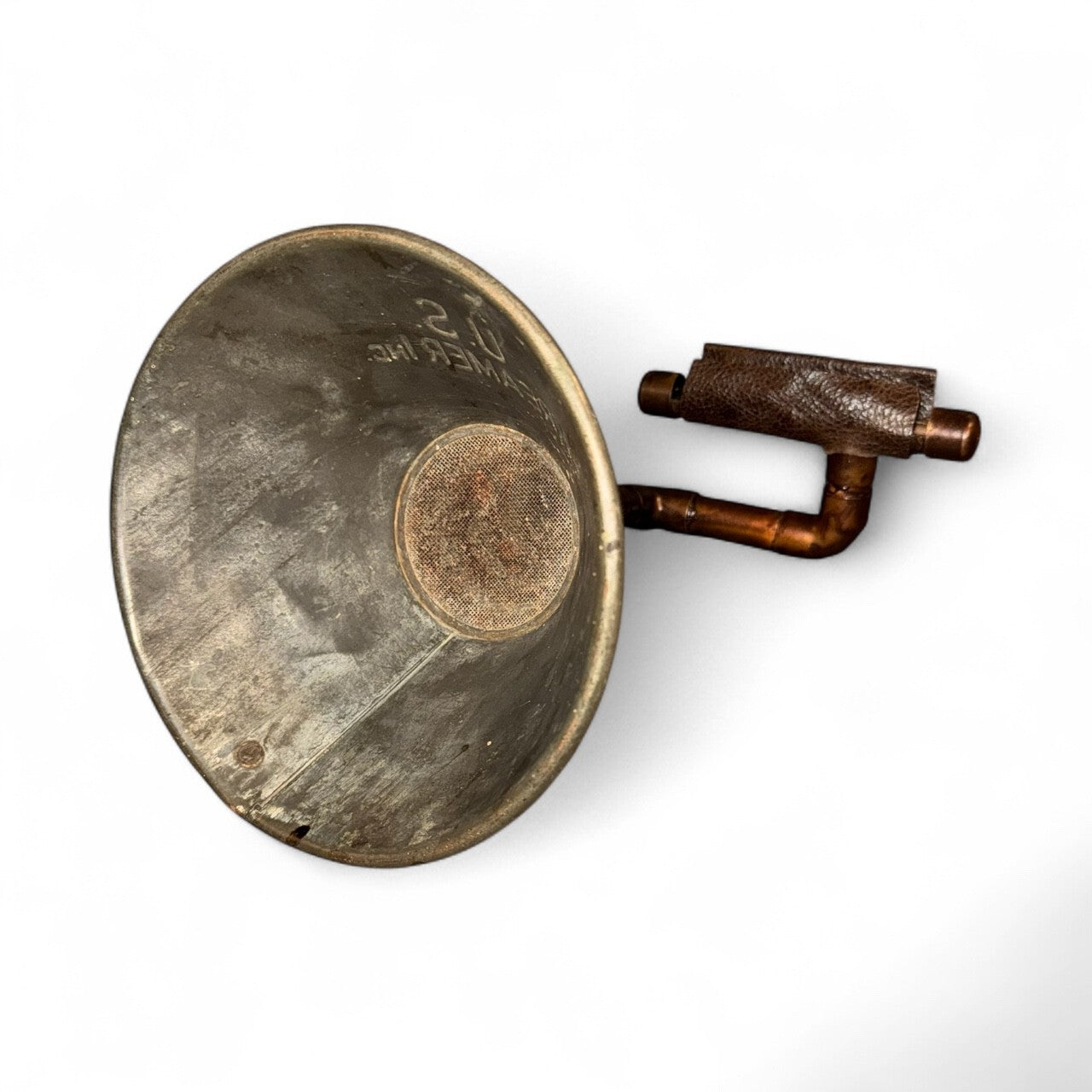 The U.S. Kreamery iHorn is made from a hand made antique copper funnel, probably from the prohibition era. Copper funnels were used as part of the still in the manufacture of illegal alcohol when our government decided it was prudent to legislate morality, an experiment gone awry. This was used in the dairy industry. The U.S. Kreamery Funnel iHorn is a simple yet effective tool, its patina and functionality work as well today as when it was first made. Regardless of its age, The U.S. Kreamery iHorn is remarkable in simplicity and grace.
