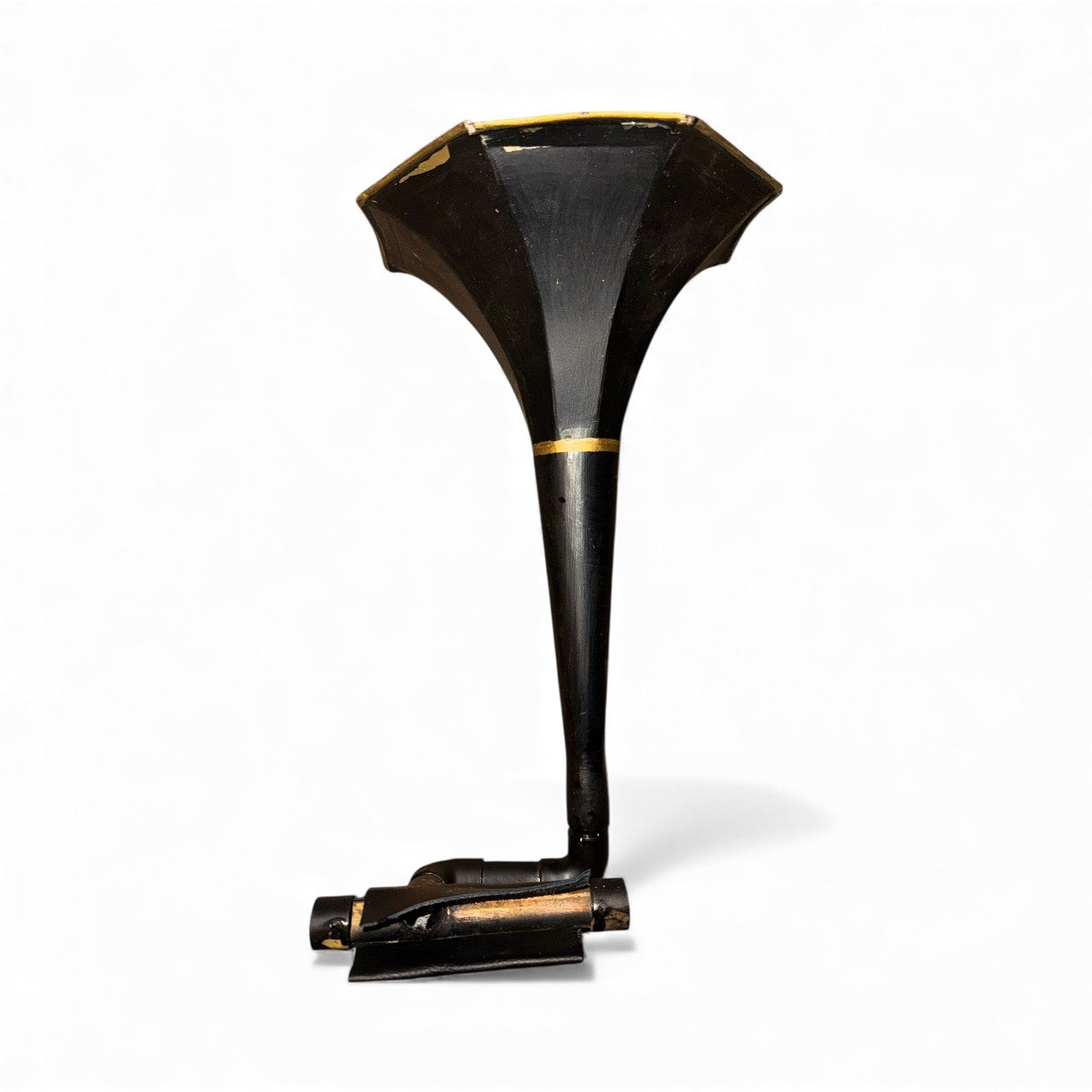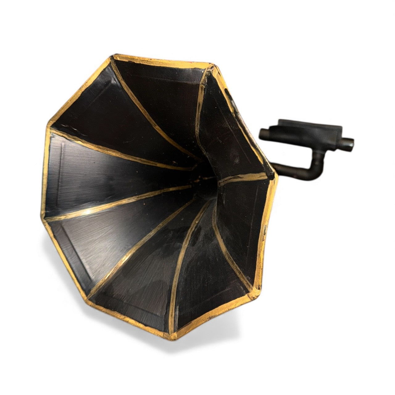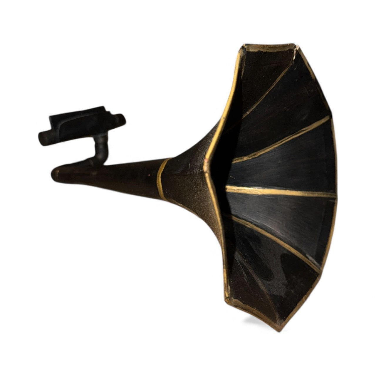 The Witch’s Hat iHORN is made from an early witch’s hat phonograph horn. I am certain it is a reproduction. The Witch’s Hat horn is an original Edison phonograph horn made of brass. They came on the Edison Home Standard Phonograph, which came in Models A through E. They were the first mass produced phonograph for the average consumer. They played a ceramic disc with a run time of two minutes. The earliest models were produced in the 1890’s. However, by 1912, the plate disc, with its extended run time of four minutes and capacity to be double sided had won out over the cylinders, rendering cylinder production obsolete. With the cyclinders obsolete, so too was the production of the Edison Standard Home Phonograph. The Witch’s Hat iHORN is a centurion. Itsimple, strong, and possesses the wisdom of the ages. Fly home on a broomstick and cackle all the way.